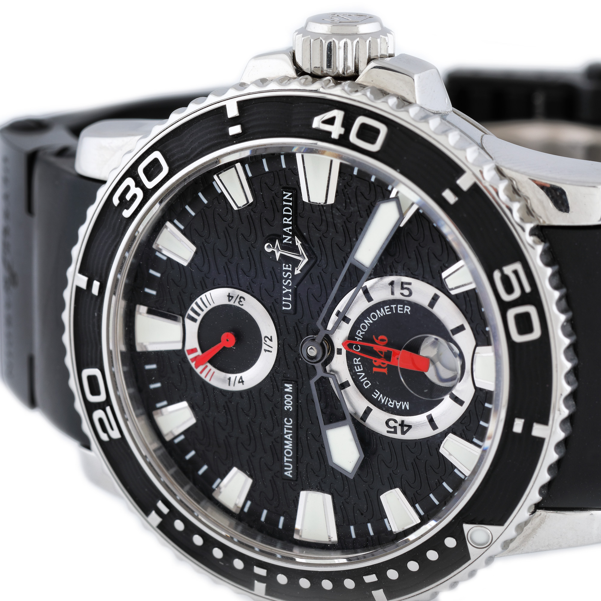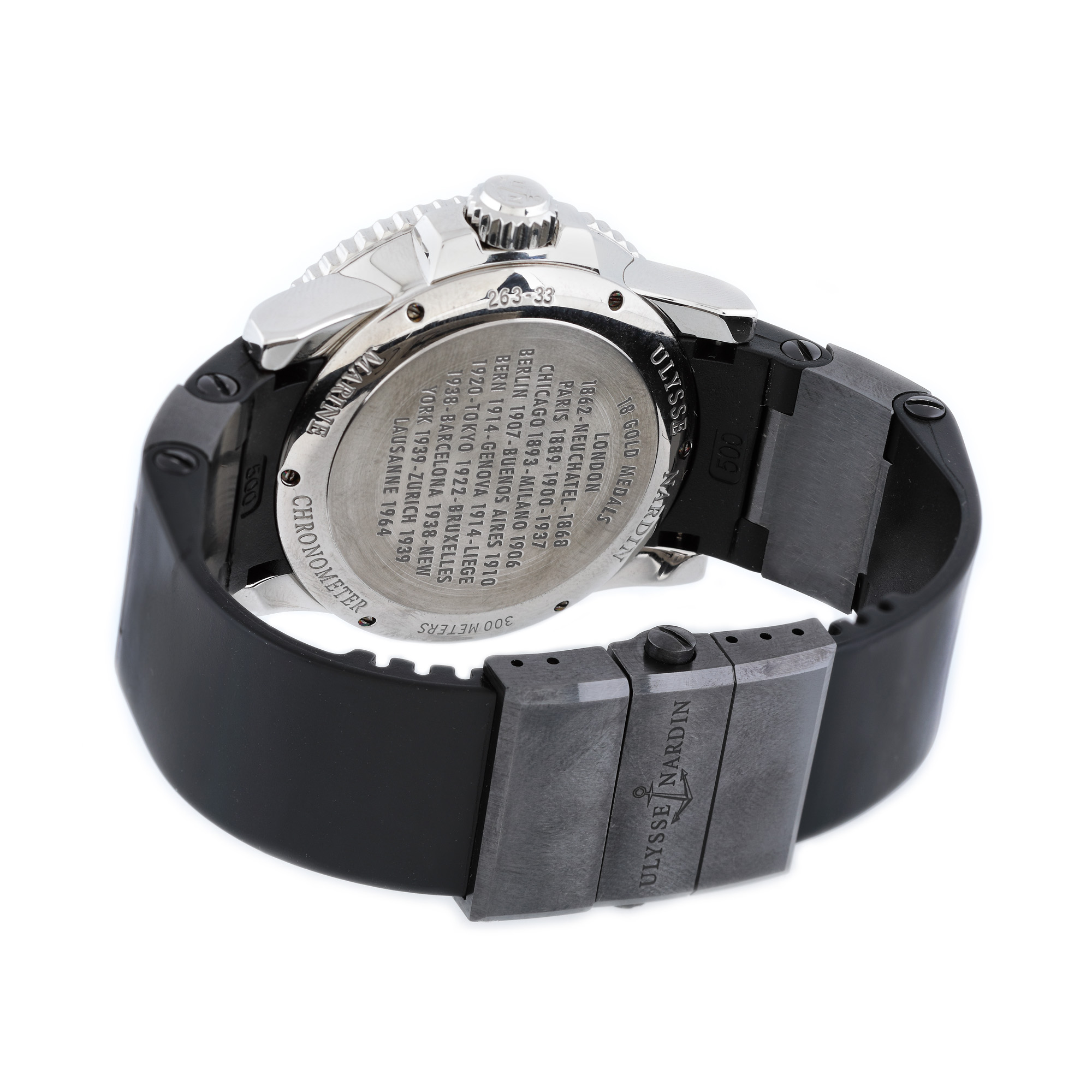 Ceas Ulysse Nardin Maxi Marine Diver, de mână, bărbătesc, referință 263-33-3/82, mecanism automatic. Cadranul negru, în "wave pattern" prezintă orar, minutar și indecși orari luminiscenți, două registre și dată cu lupă la ora 6. Bezelul este rotativ unidirecțional iar cureaua de culoare neagră, din cauciuc are închizătoare tip deployant. Ceasul vine însoțit de actele de proveniență.