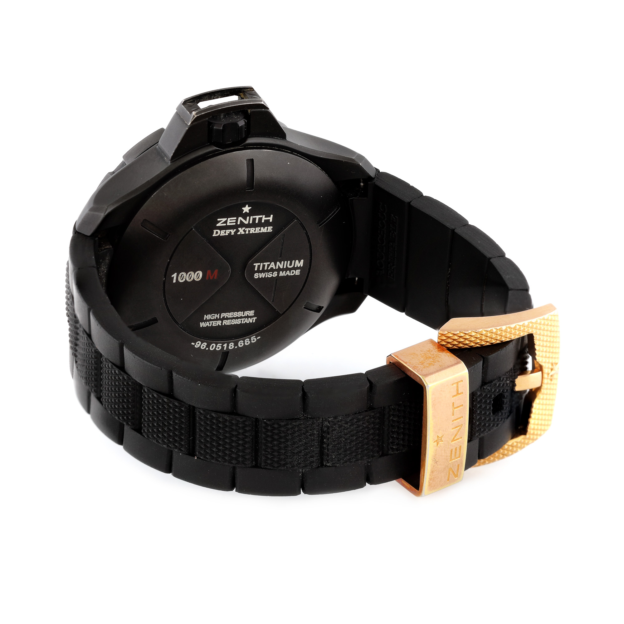 Ceas Zenith Defy Xtreme, din titan, de mână, unisex, referință 96.0518.685, mecanism automatic. Cadran de culoare negru, decorat în tehnica guilloché cu două registre, bezel rotativ, unidirecțional și dată cu lupă între orele 4-5. Curea din cauciuc, de culoare negru și cataramă din aur roz, originale. Ceasul vine însoțit de actele de proveniență.