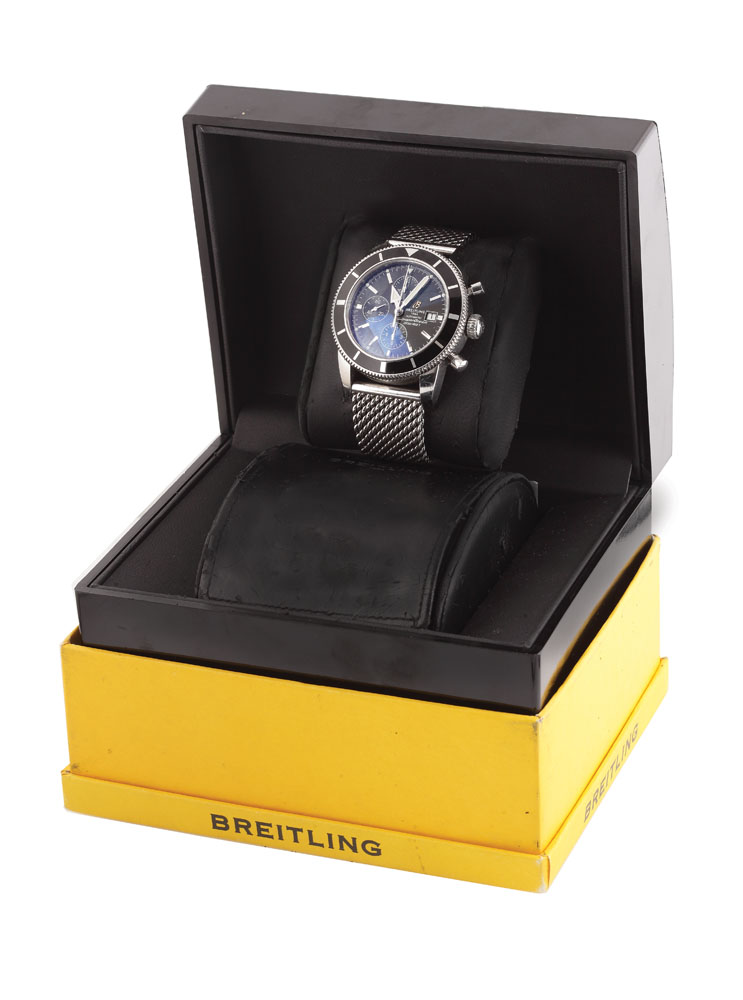 Ceas Breitling Superocean Heritage Chronograph, de mână, bărbătesc. Mecanism automatic. Referință A13320. Cadran negru cu trei registre interioare, dată la ora 3. Bezel rotativ unidirectional. Ceasul este diver la 200 m. Vine însoțit de actele de proveniență și cutia originală.