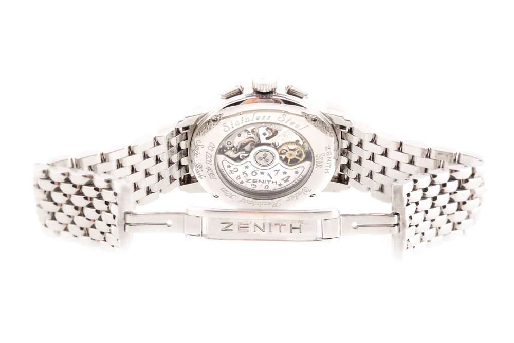 Ceas Zenit, model Glam'Rock Star Open, de mână, de damă, cu mecanism automatic El Primero, chronograph. Cadranul, pavat cu diamante, prezintă indicator de rezervă de timp, mecanism vizibil între ora 10 şi 11 şi vitrat. Număr referinţă: 03 1231 4021. Însoţit de cutie originală.