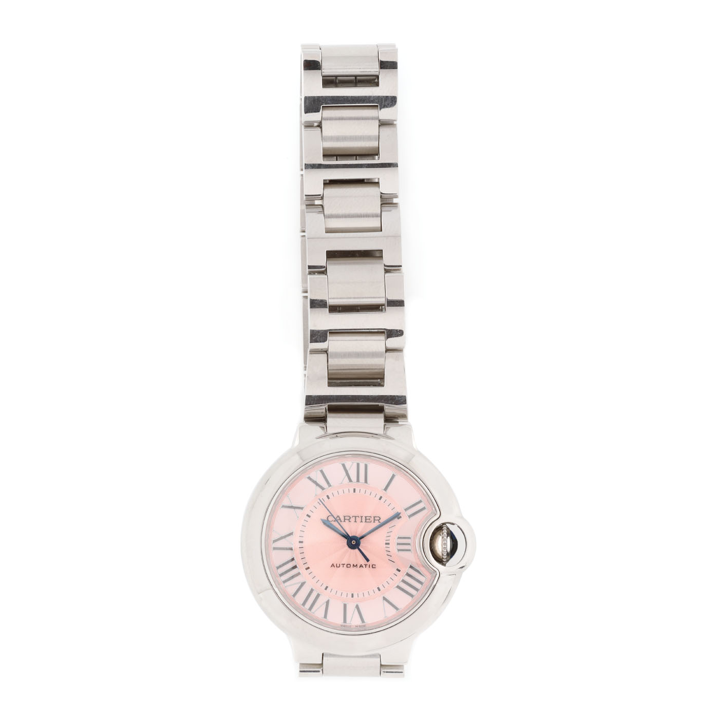 Ceas Cartier Ballon Bleu, de mână, de damă. Referință 3489. Mecanism automatic. Cadran de culoare roz cu cifre romane.