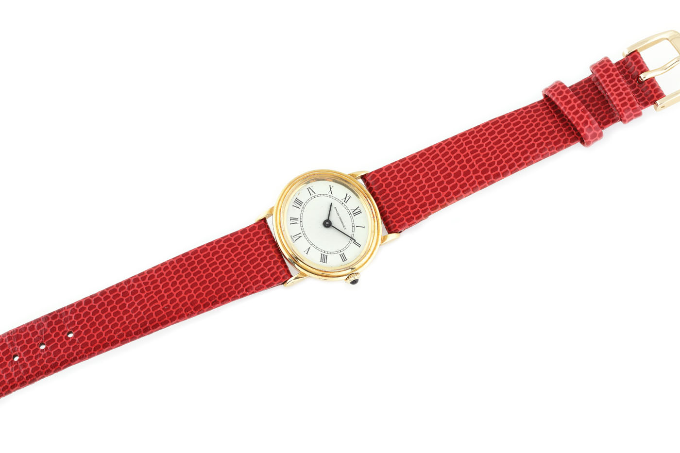 Ceas Girard Perregaux, de mână, de damă. Mecanism cu armare manuală. Carcasă ovală, cadran de culoare crem, decorat cu cifre romane. Curea din piele de culoare roșie.