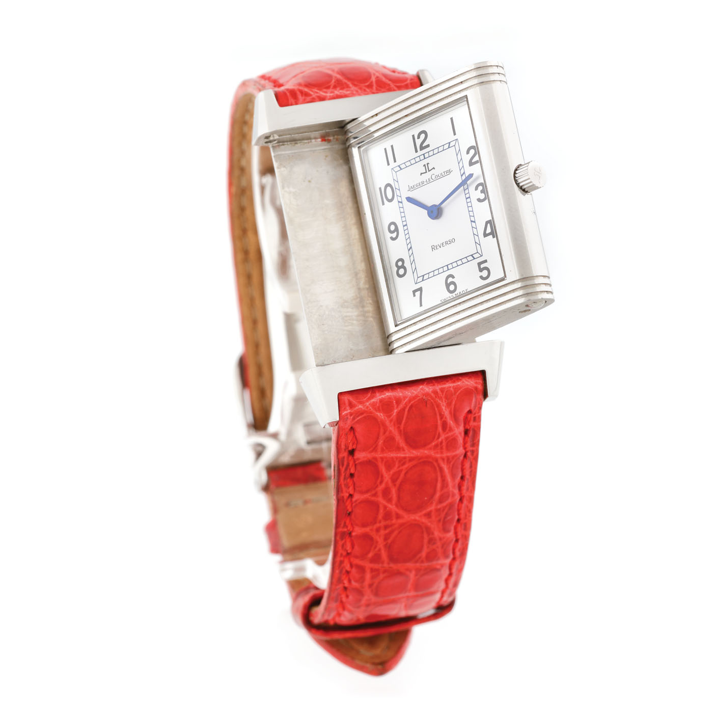 Ceas Jaeger LeCoultre Reverso Classique, de mână, unisex. Mecanism quartz, referință 250.8.08. Cadran de culoare argintie și cifre arabe. Carcasă mobilă, de dimensiune medie. Curea din piele de crocodil, culoare roșie și închizătoare tip deployant.