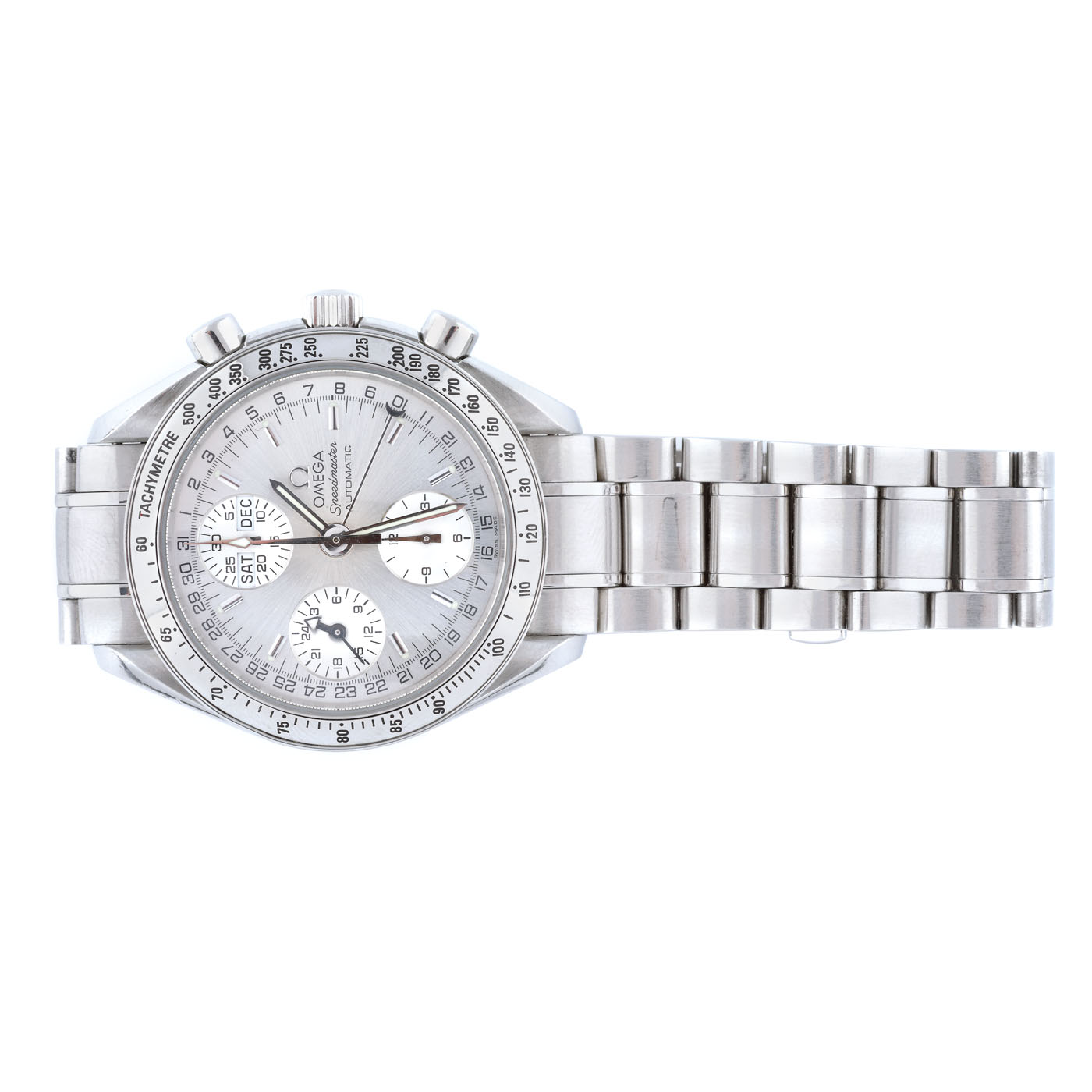 Ceas Omega Speedmaster Triple Date, de mână, unisex. Referință 35233000. Mecanism automatic cronograf. Cadran de culoare gri. Ceasul indică ziua lunii, ziua săptămânii și luna în curs. Vine însoțit de cutia originală și actul de proveniență.