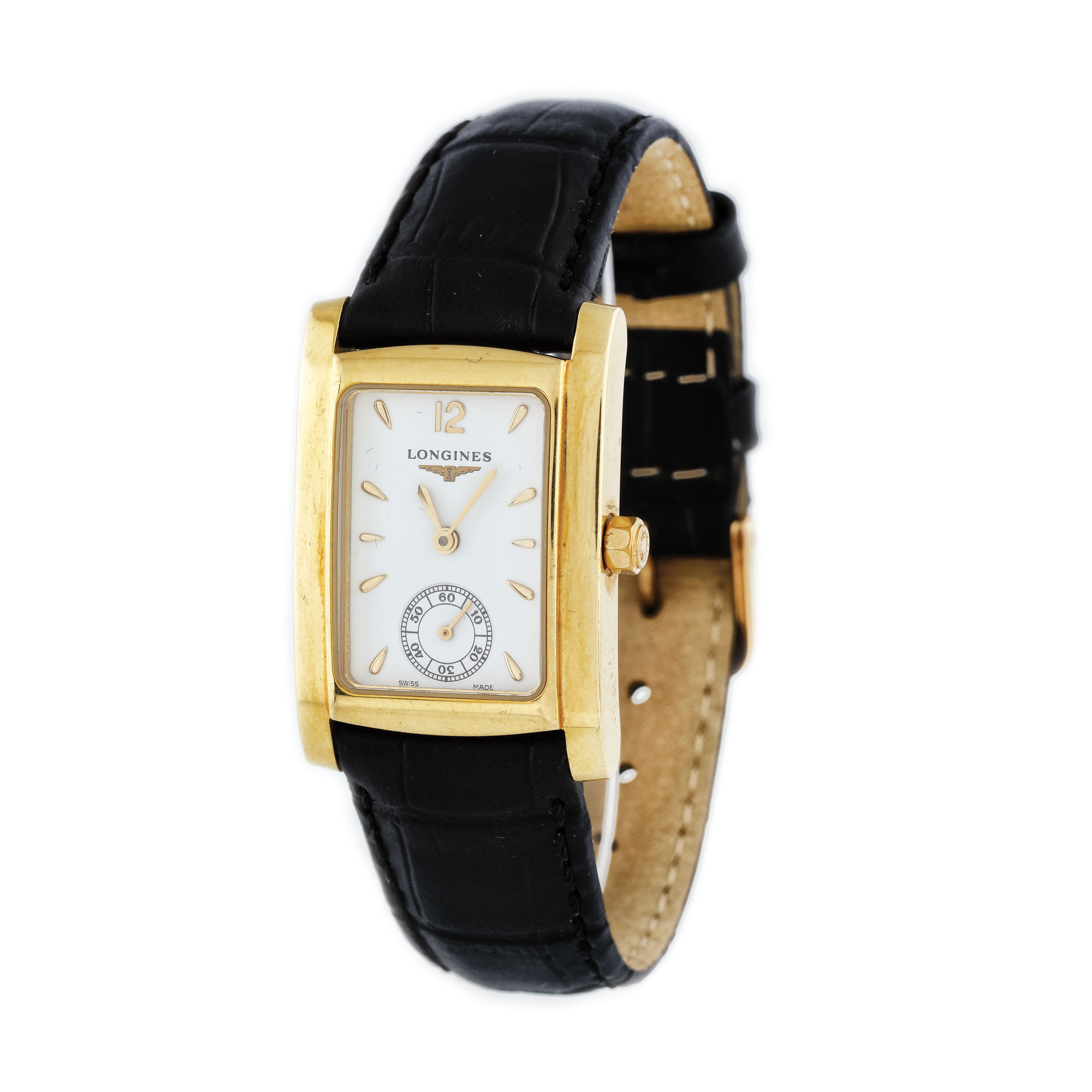 Ceas Longines DolceVita, de mână, de damă, din aur. Mecanism quartz. Referință L5.502.6. Cadran de culoare albă și secundar la ora 6. Curea din piele, de culoare neagră și cataramă din oțel aurit cu aur galben.