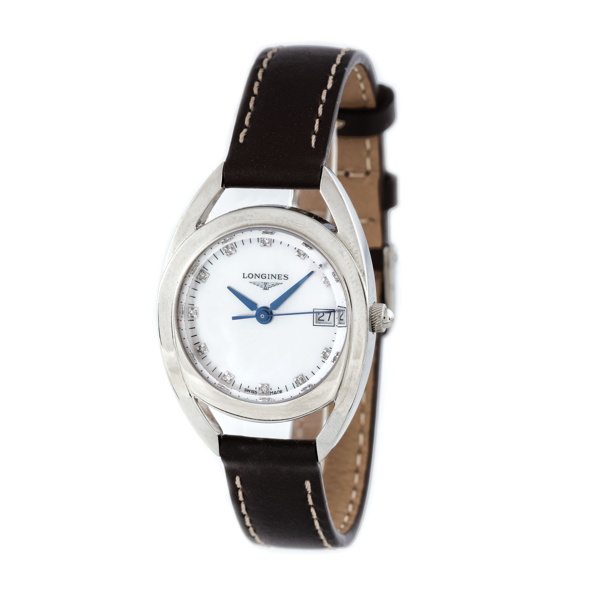 Ceas Longines Equestrian, de mână, de damă. Mecanism quartz, referință L6.136.4. Cadran din sidef, diamante în locul orelor și dată la ora 3. Curea din piele, de culoare brun și cataramă din oțel.