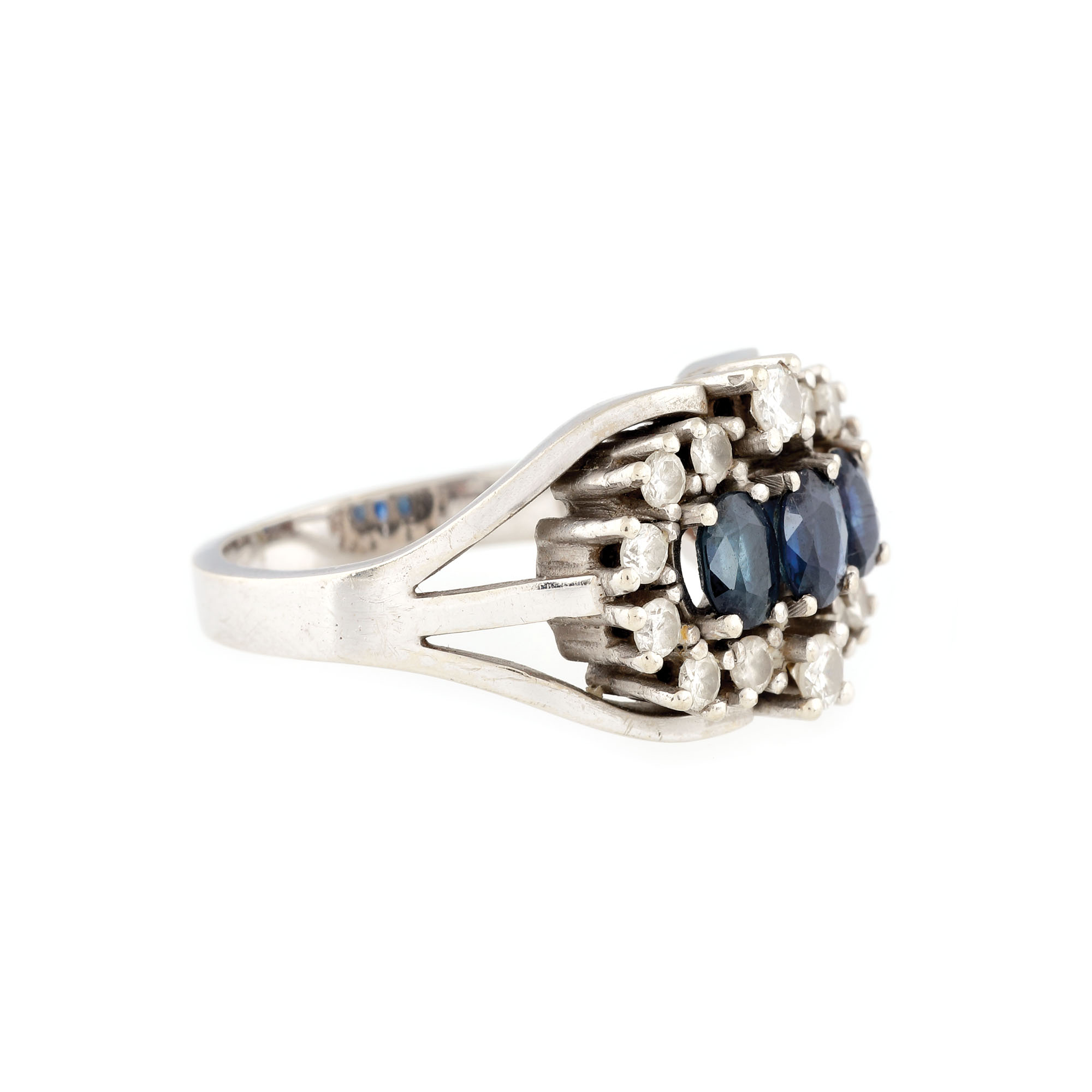 22. Inel din aur alb, decorat cu triadă de safire anturată de diamante
