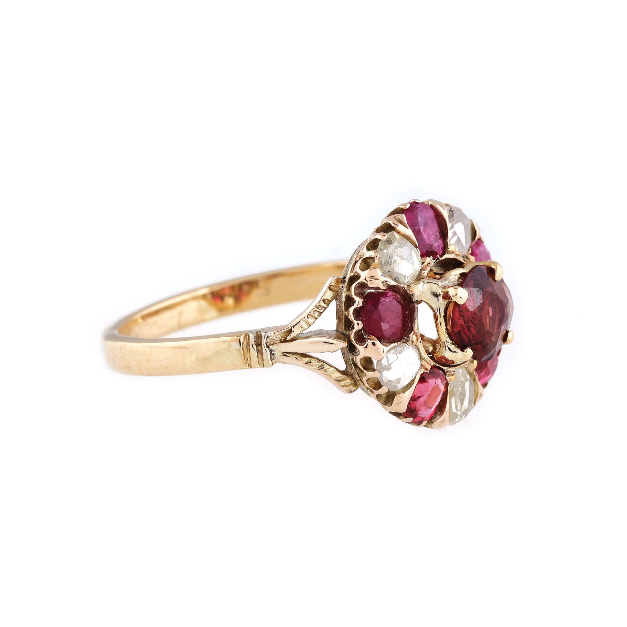 24. Inel vintage, din aur, ornat cu un granat central, rubine și diamante
