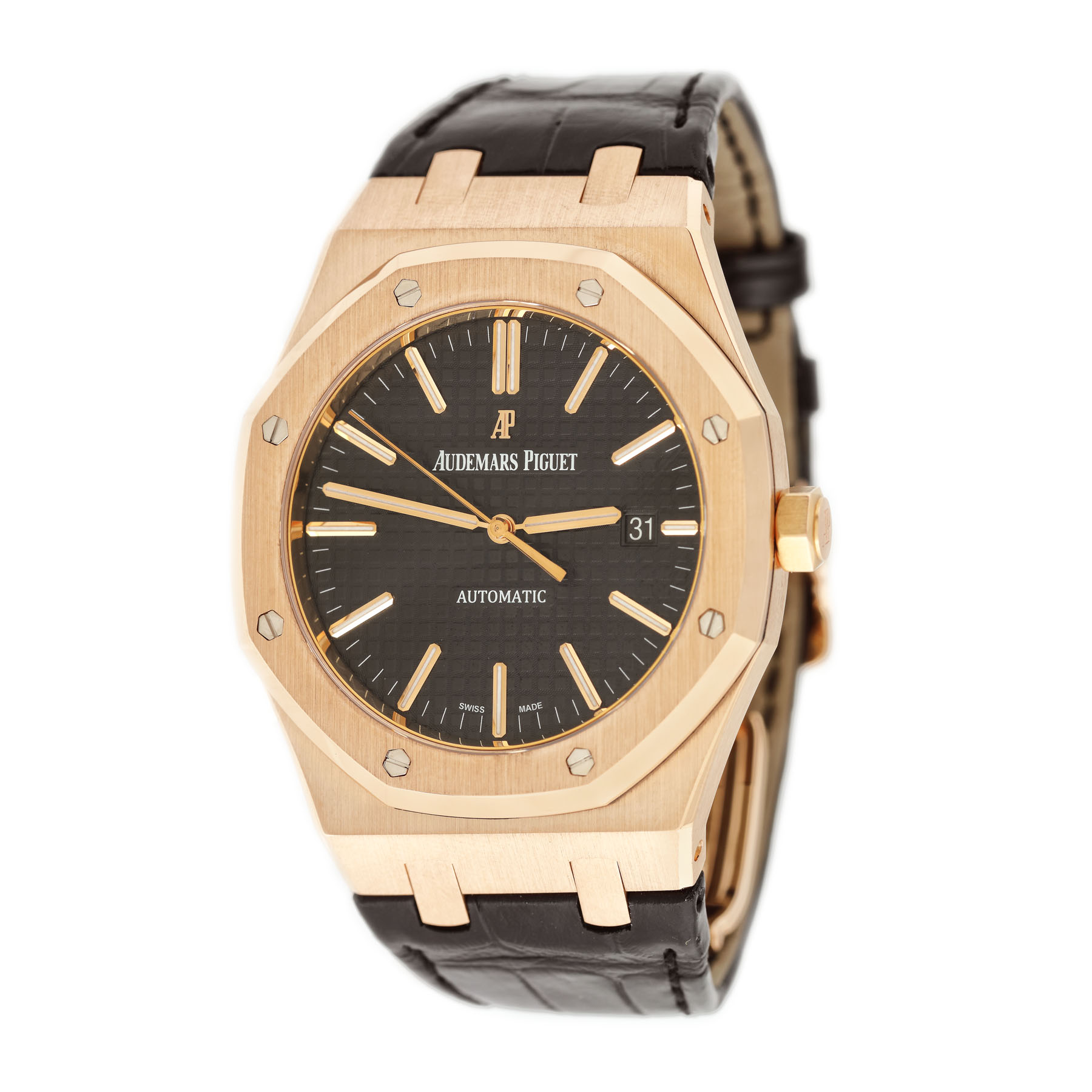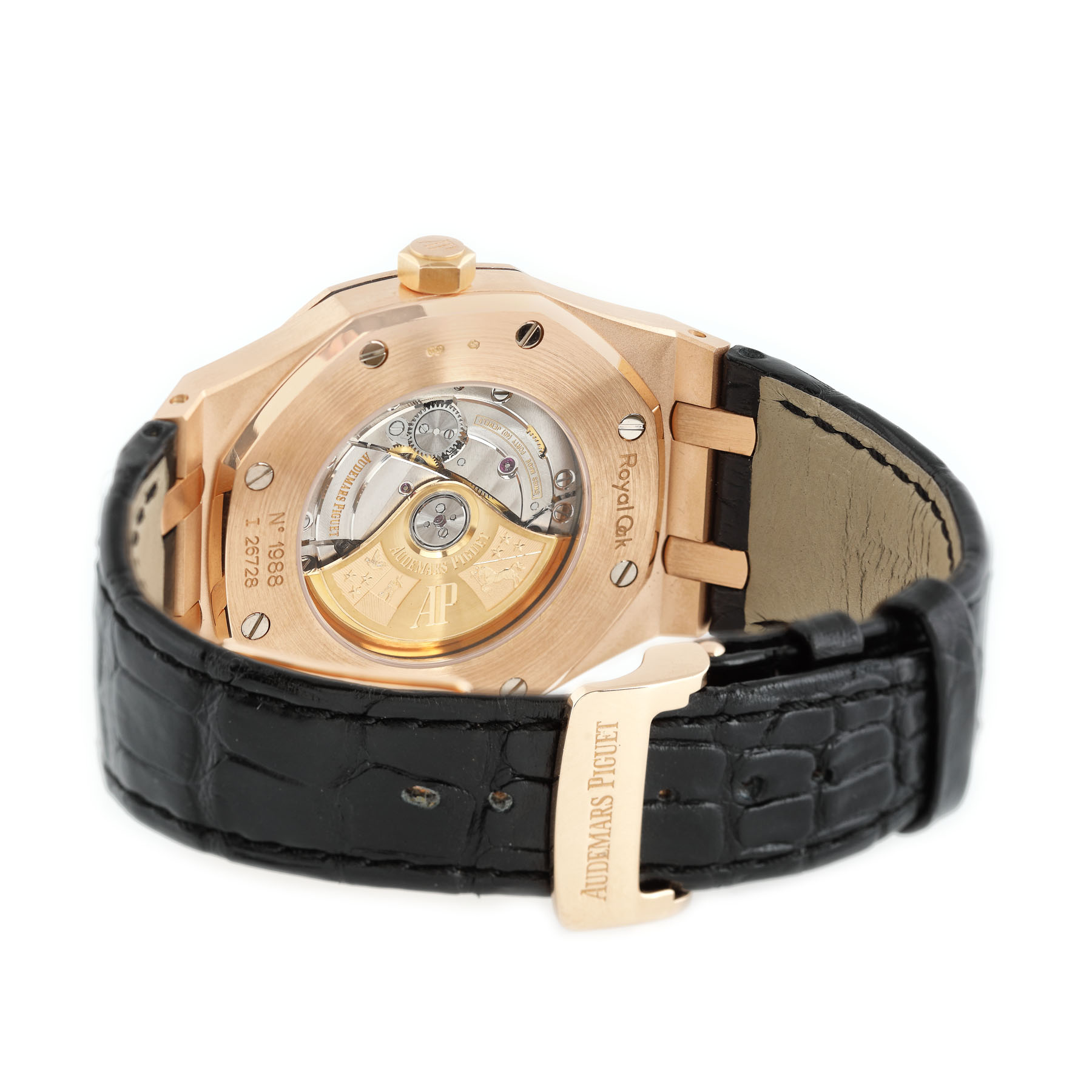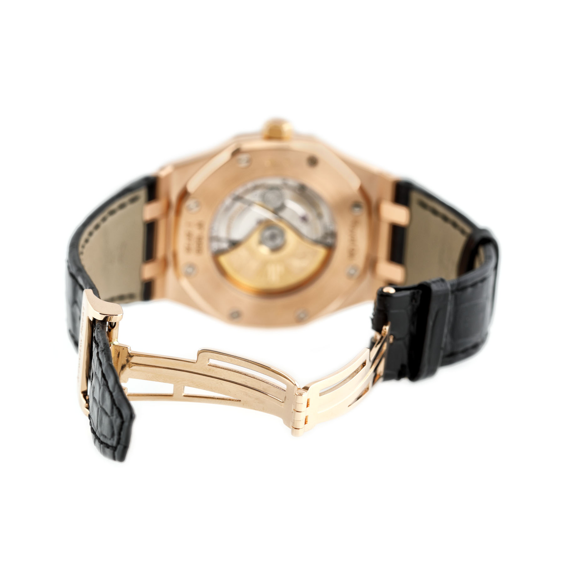 Ceas Audemars Piguet Royal Oak, din aur roz, referință 15400, mecanism automatic, anterior vitrat și rezervă de timp de 40 h. Cadran de culoare negru și dată la ora 3. Curea din piele de crocodil de culoare negru și catarama originală din aur roz de 18 k. Ceasul vine însoțit de actele de proveniență.