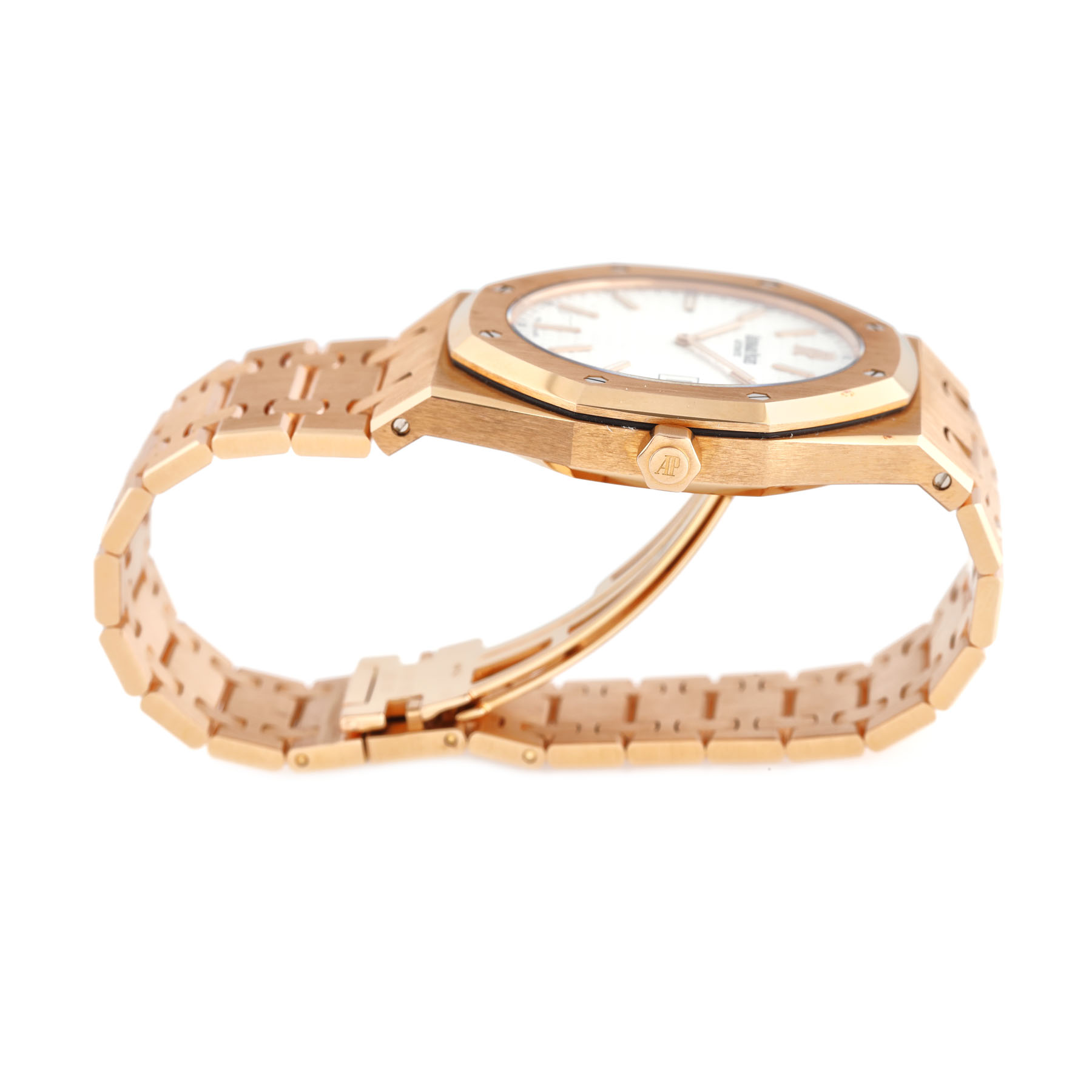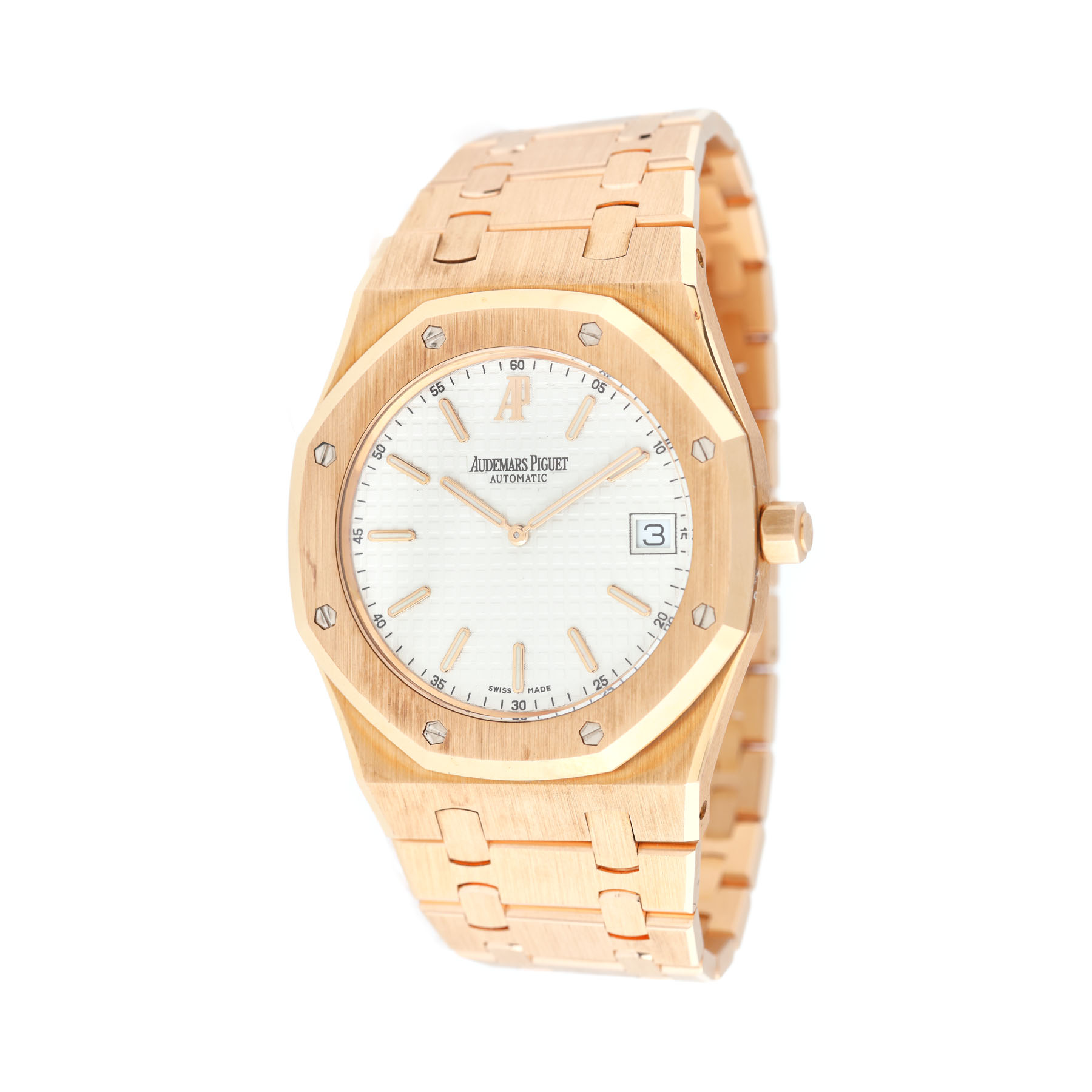 Ceas Audemars Piguet Royal Oak Ulta-Thin din aur roz, referință 15202. Mecanism automatic, anterior vitrat, calibru 2121, rezervă de timp 40 h. Cadran de culoare alb, cu dată la ora 3. Bezel, carcasă și brățară atent finisate. Ceasul vine însoțit de actele de proveniență și cutia originală. Ceasul este o relansare a unui model realizat în anul 1972, de către Gerald Genta, având în acel moment cele mai mici dimensiuni pentru un ceas cu mecanism automatic , respectiv 7 mm grosime. Raritatea combinației dintre aur roz și culoarea cadranului alb este o altă particularitate ce face ca acest model să fie un bun de colecție.
