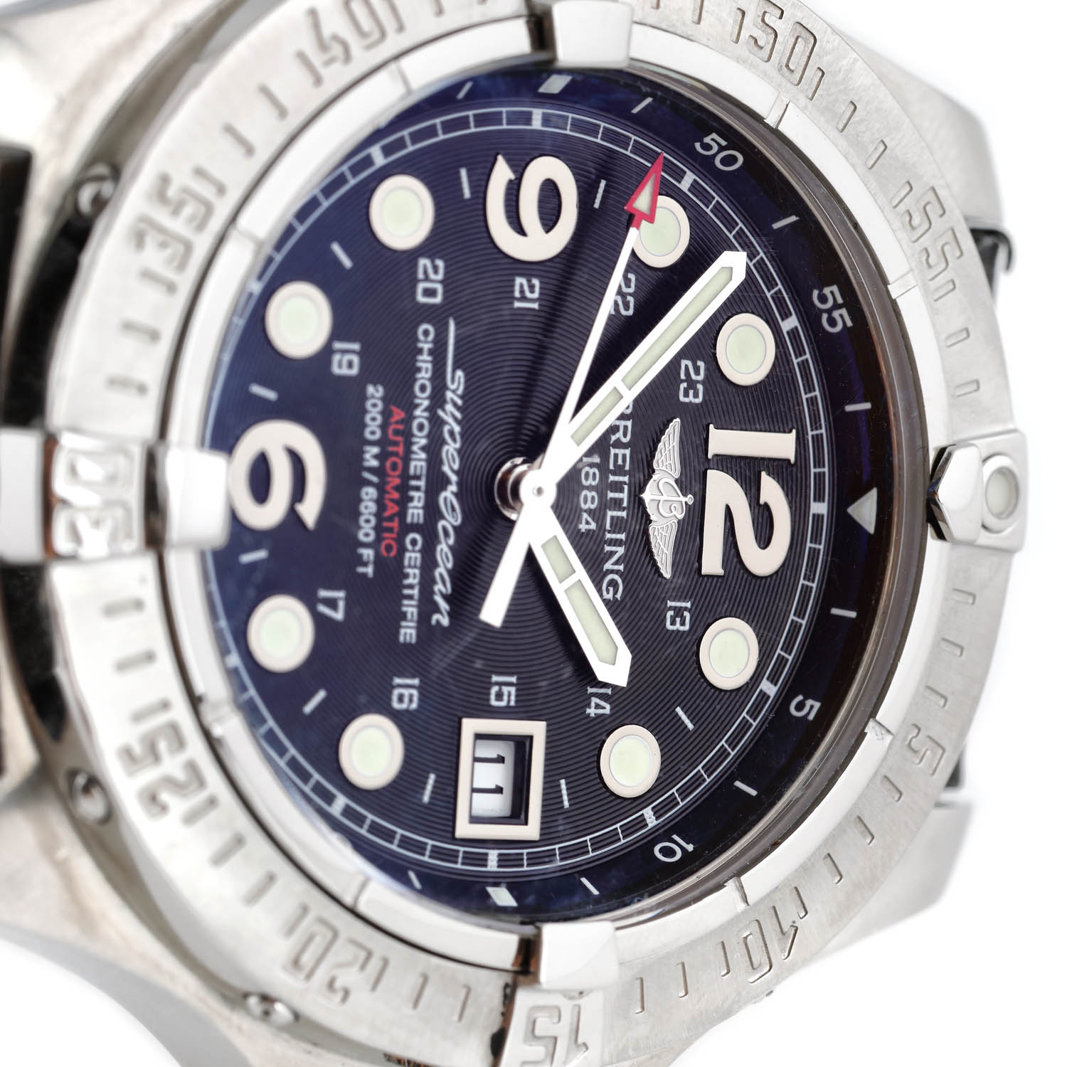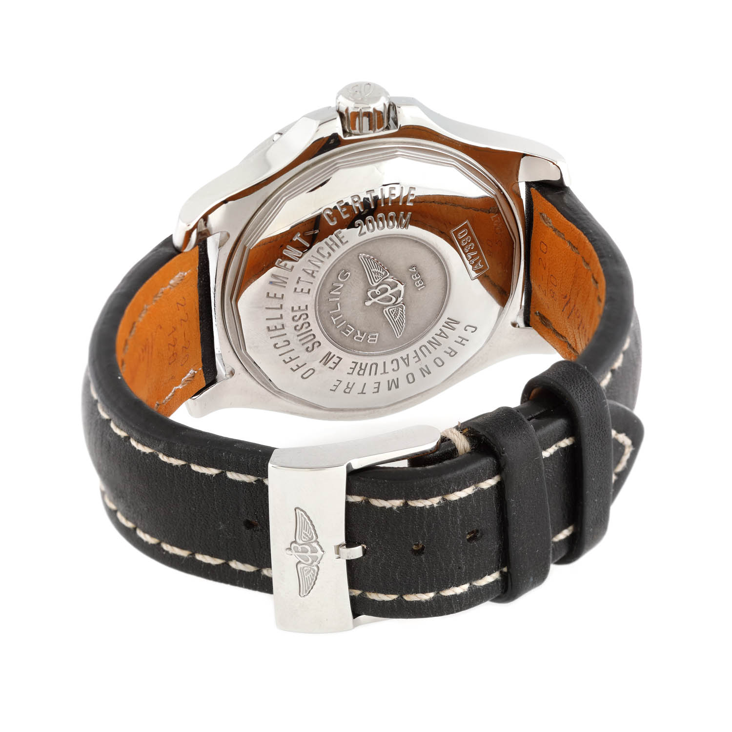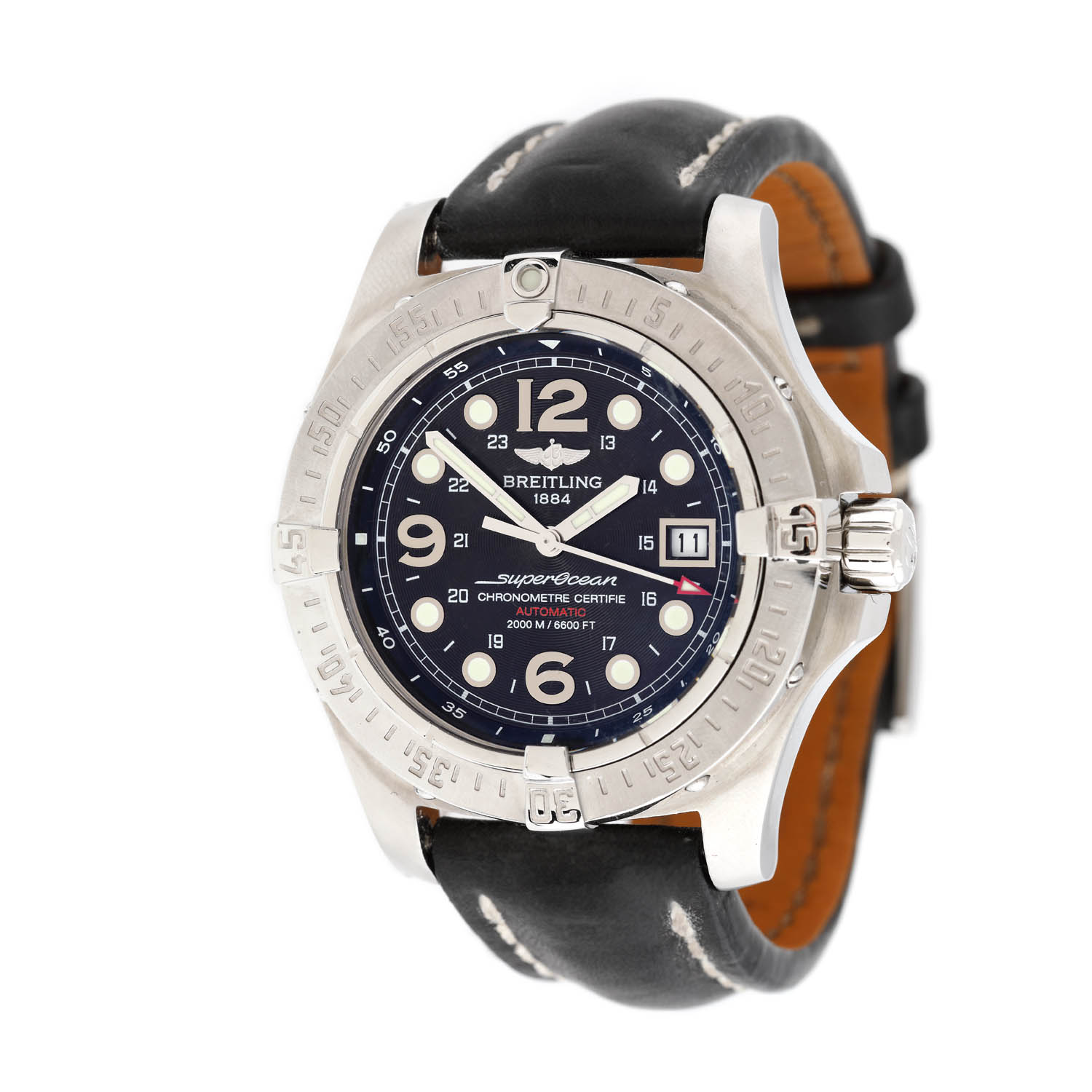 Ceas Breitling Superocean Steelfish, de mână, bărbătesc, având referința A17390, mecanism automatic, rezistent la o adâncime de până la 2000 m, cu rezervă de timp de 42 h. Cadran de culoare negru, cifre arabe, dată în dreptul orei 3, cu bezel rotativ. Curea din piele, de culoare negru și cataramă originală.