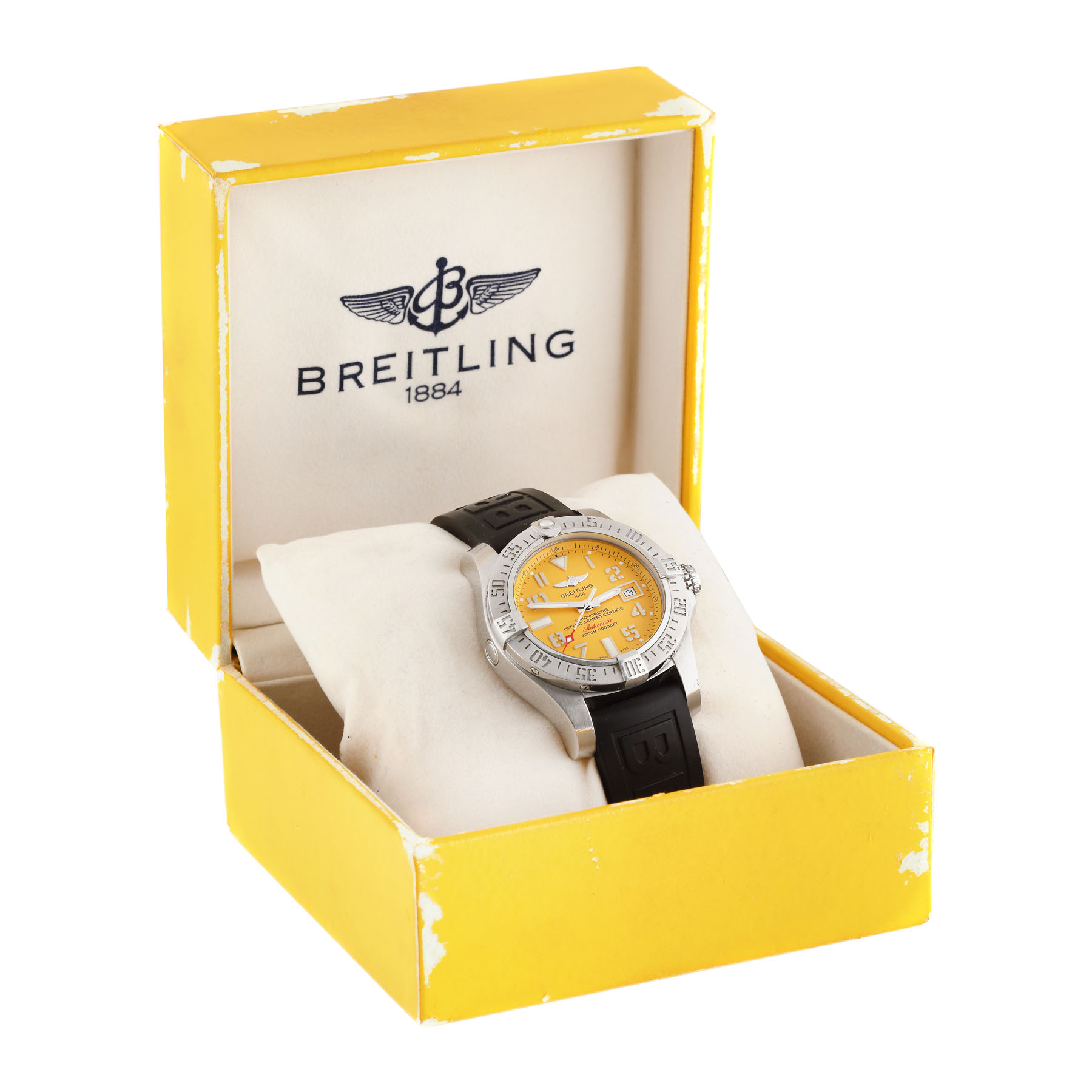Ceas Breitling Avenger II Seawolf, de mână, bărbătesc, referință A17331, mecanism automatic, cu cronometru, cadran de culoare galben cu cifre arabe, orar și minutar luminiscente și dată în dreptul orei 3. Modelul este super-diver, cu carcasă rezistentă la adâncimi de până la 3000 m. Bezelul rotativ bidirecțional e gravat cu numerale, iar cureaua este din silicon negru.