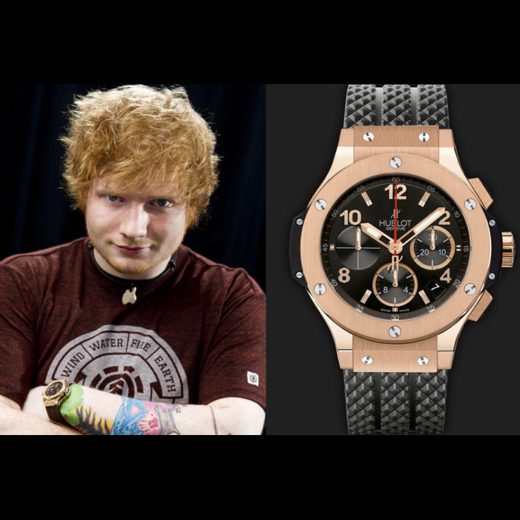 Ceas Hublot Big Bang, din aur roz și ceramică, referința 301.PB.131.RX. Mecanism automatic cronograf, anterior vitrat, cu rezervă de timp, calibru HUB4100. Cadran de culoare negru, cu cifre arabe, trei registre și dată între orele 4-5. Curea din silicon, de culoare negru și închizătoare originală, tip deployant. Ceasul vine însoțit de cardul de garanție. Acest model a fost purtat de celebrul cântăreț Ed Sheeran.
