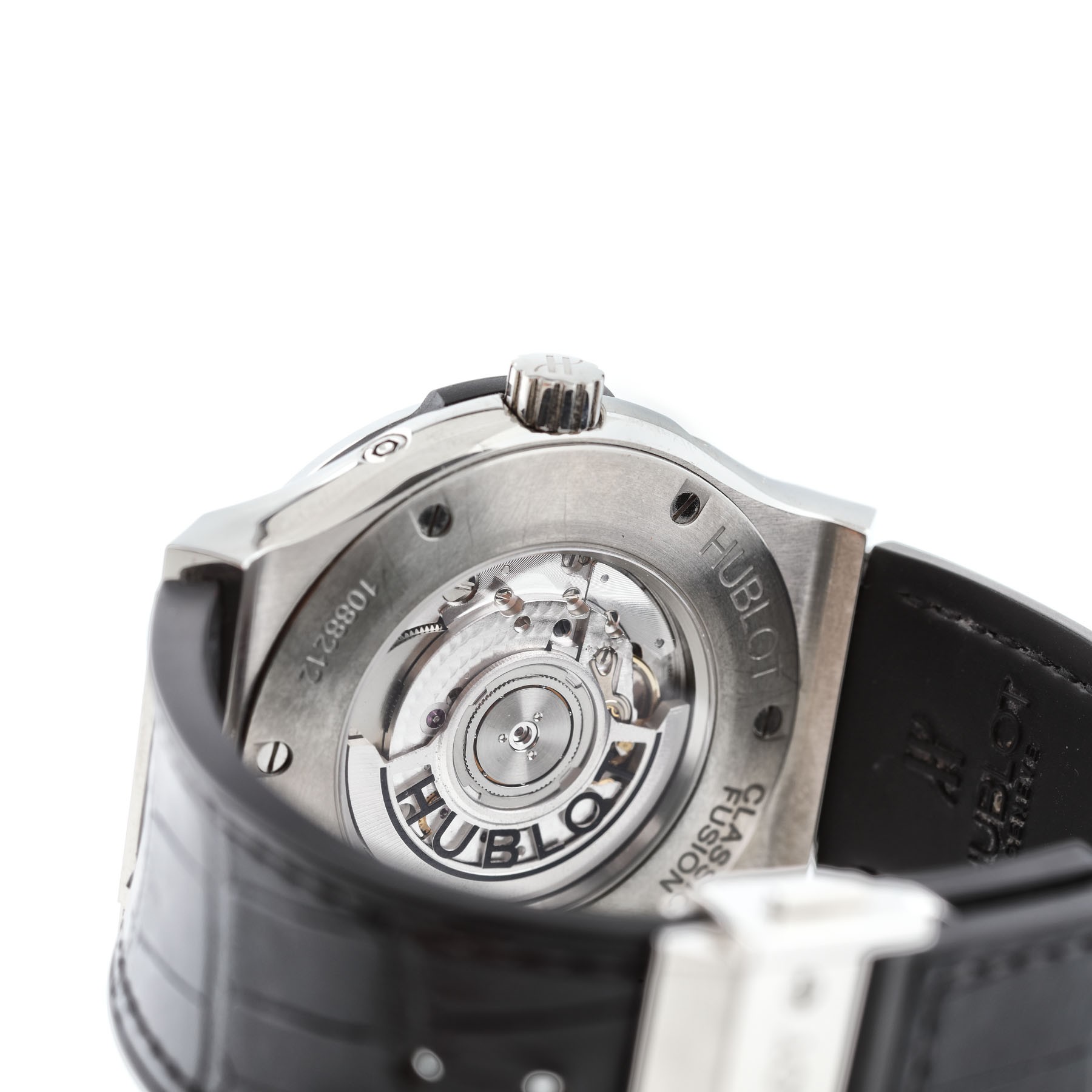 Ceas Hublot Classic Aerofusion Moonphase, din titan, de mână, bărbătesc, referință 517.NX.0170.LR, mecanism automatic cronometru, vitrat anterior, calibru HUB1131, cu rezervă de timp de 42 h. Cadran skeletonizat, cu limbi și indicatori orari din oțel. Registrele pentru ziua săptămânii și lună se intersectează într-o fereastră localizată în dreptul orei 12. Registru cu fazele lunii în dreptul orei 6. Bezel fix din titan, curea neagră din piele de crocodil și cataramă din oțel inoxidabil tip deployant.