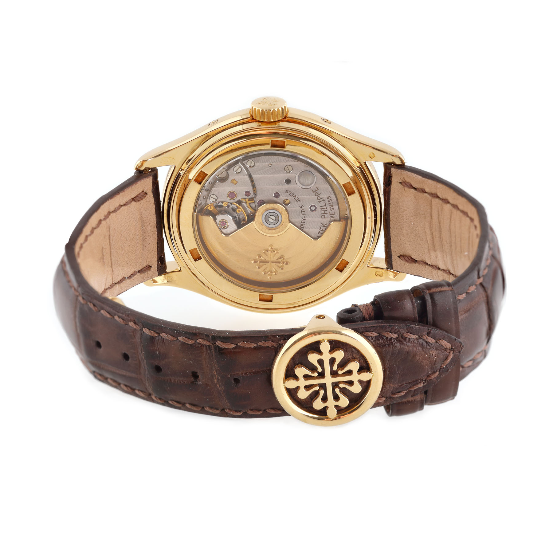 Ceas Patek Philippe Calatrava, din aur, referința 5035J, mecanism automatic, anterior vitrat. Cadran de culoare albă, cu cifre romane, calendar anual și dată la ora 6. Curea din piele de crocodil de culoare maro și închizătoare originală din aur, tip deployant. Ceasul vine însoțit de cutia originală.
