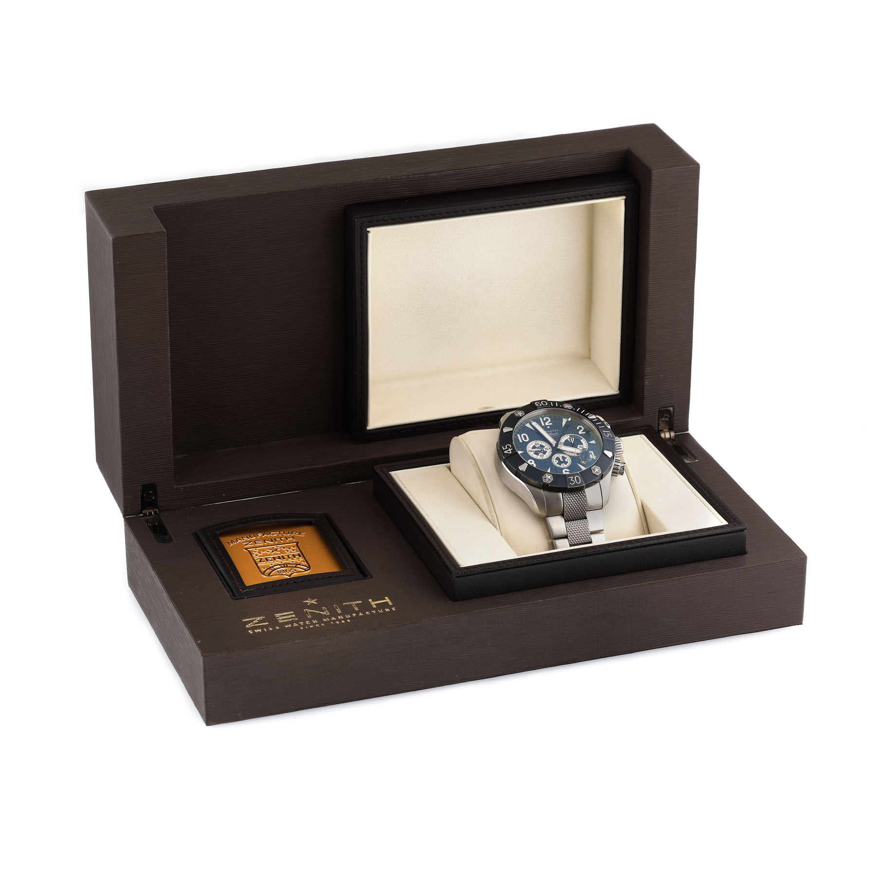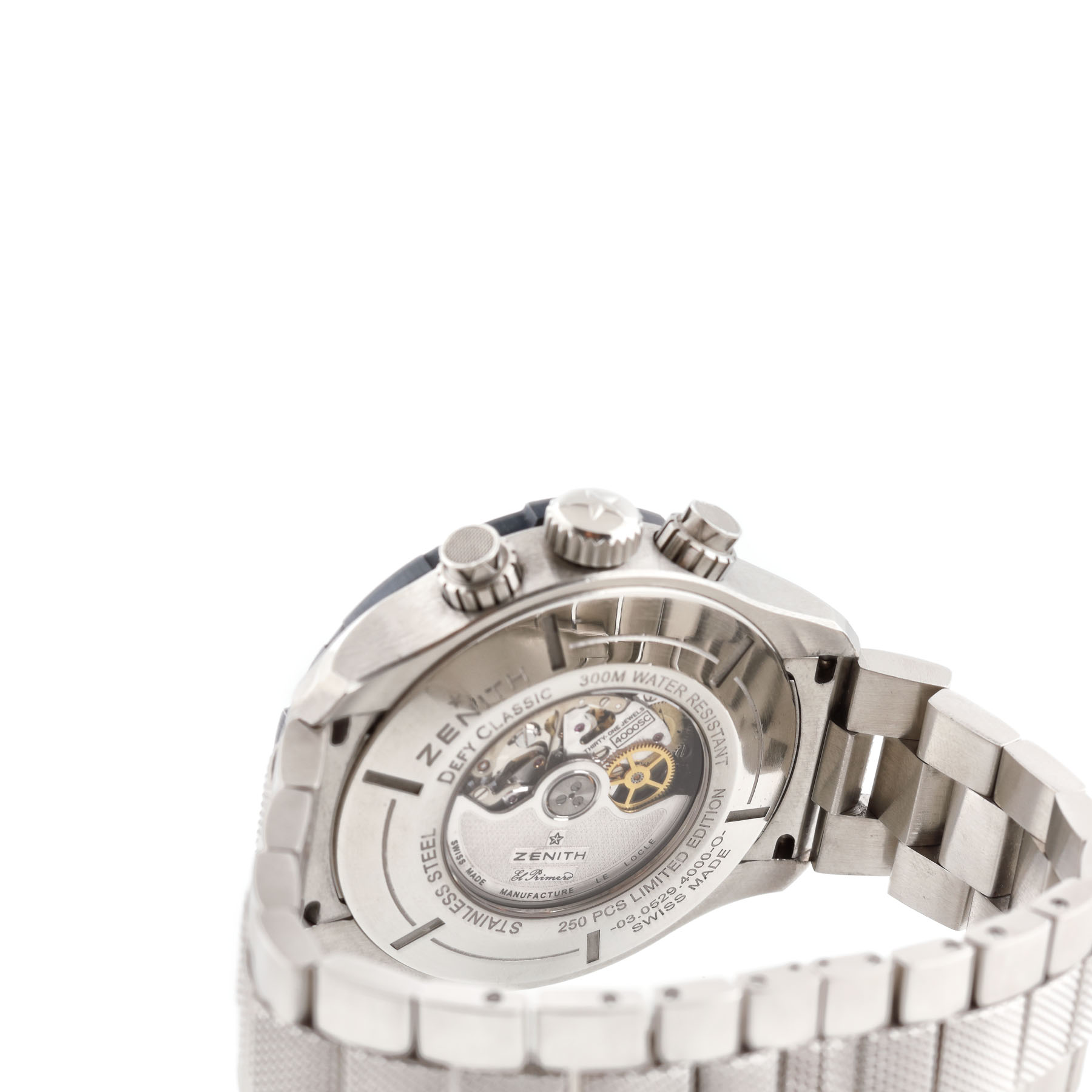 Ceas Zenith Defy El Primero, de mână, bărbătesc, ediție limitată, din oțel, referință 03.0529.4000-. Mecanism automatic, cronograf, calibru 4000SC. Cadran ”blue wave pattern”, cifre arabe, trei registre și dată cu lupă între orele 4-5. Ceasul vine însoțit de manualul de utilizare și cutia originală.