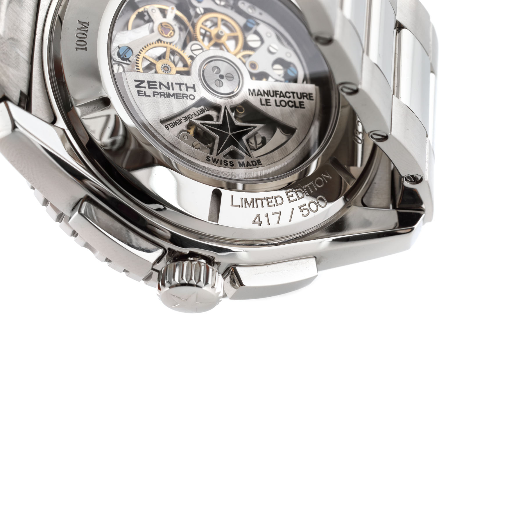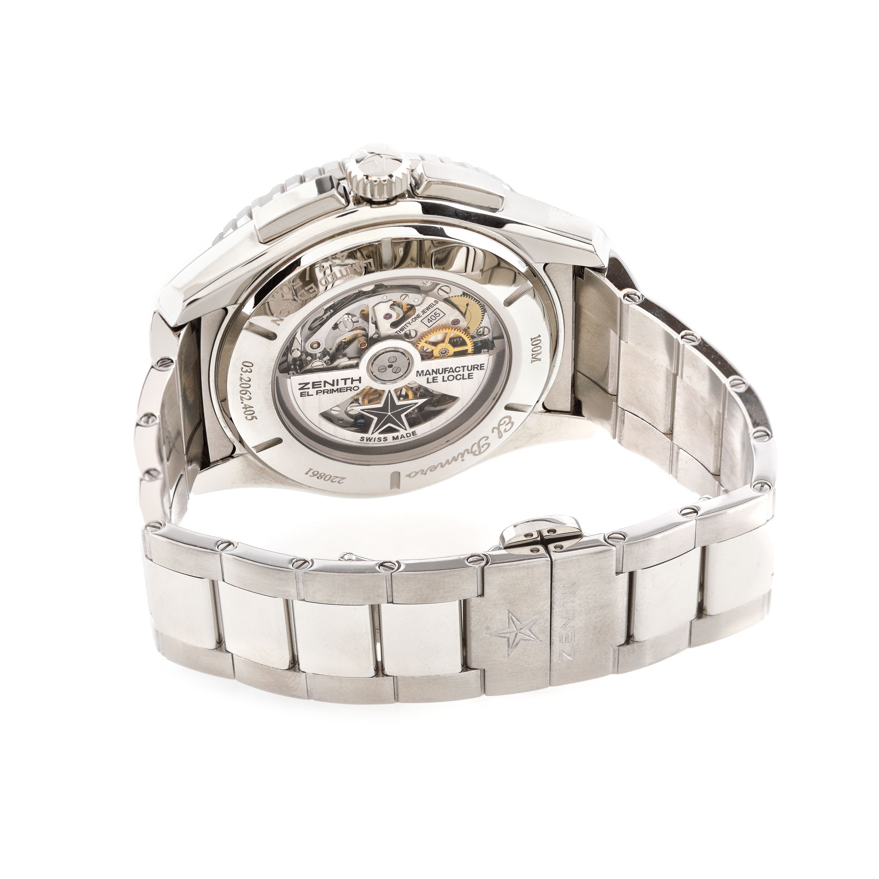Ceas Zenith El Primero Blashford, de mână, bărbătesc, din oțel inoxidabil, ediție limitată no. 417/500, referință 03.2062.4057/07.M2060, mecanism automatic, anterior vitrat. Cadran silver, trei registre și dată în dreptul orei 3. Ceasul vine însoțit de cardul de garanție, manualul de utilizare și de cutia originală.