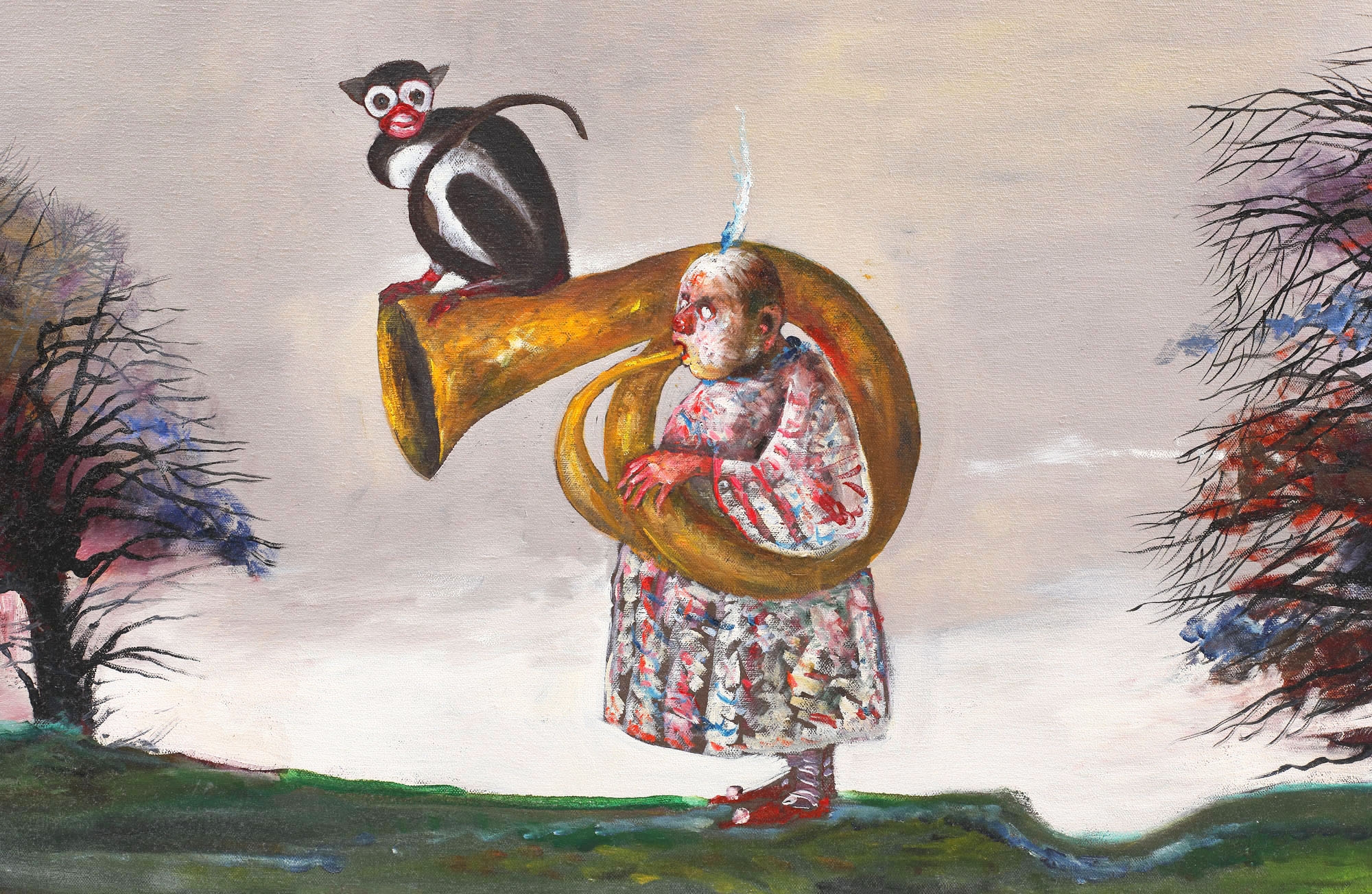 Lucrările lui Ștefan Câlția ne invită să visăm cu ochii mari deschiși, cu atenția prinsă între vis și realitate, dezvăluindu-ne astfel o dimensiune “veche de când lumea”. Ființa și neființa așteaptă sufocate de emoție, iar această emoție dospită a așteptării a impregnat personajelor un aer năuc. Ca în majoritatea lucrărilor lui Ștefan Câlția, soarele nu apare reprezentat, lumina vine de niciunde, ca o boare catifelată, care potențează cromatica tabloului. Artistul dezvăluie un mic “teatru al lumii” în lucrarea curentă, un teatru încărcat de simboluri, un univers de viață filtrat prin rațiune și cultură, cu personaje surprinse în interpretarea rolului asignat de Creator. Ramificațiile culturale care dau viață acestui cadru sunt multiple: valorile de viață din satul transilvănean, memoria colectivă a basmelor populare românești, lumea teatrului de marionete, jocurile populare cu alai etc. În opera lui Ștefan Câlția, funcția personajului este crucială. Personajele concentrează principalele semnificații ale imaginii plastice, potențând sensul său de fabulă. Costumația personajelor amintește de cortegiile carnavalești, accentul picând pe caracterul ludic și oniric al scenei. Există două tipuri iconografice: personajul uman și personajul animal. Atmosfera imaginii sugerează simultan haz, mister, dar și o anumită melancolie, departe de bucuria unei atmosfere de sărbătoare.