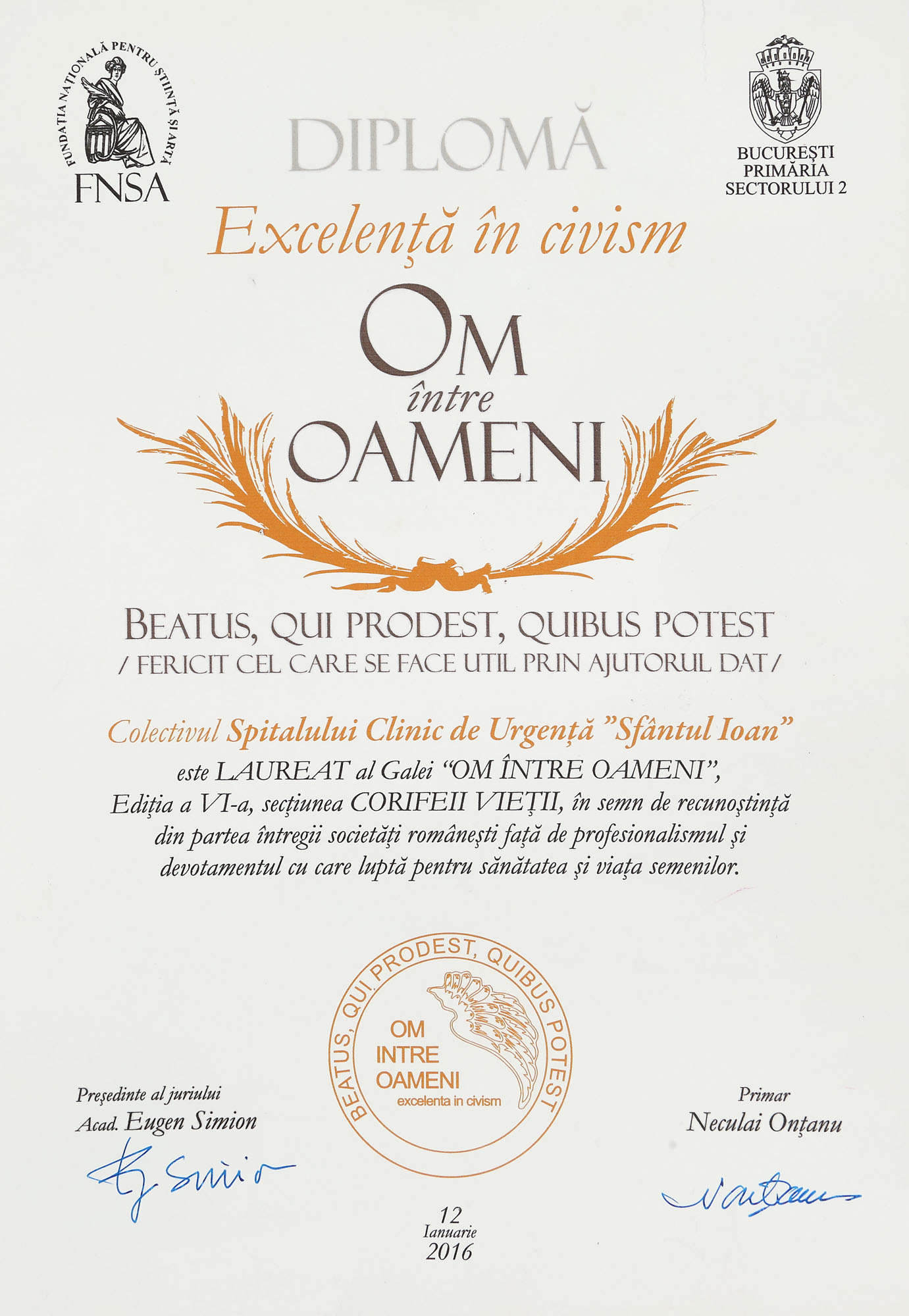 24. Diplomă, medalie și premiu pentru excelență în civism ”Om între oameni”, oferit Spitalului Clinic de Urgență ”Sfântul Ioan” pentru activitatea de salvare a victimelor accidentului ”Colectiv”, ianuarie 2016, donație a lui Robert Agafiţei, managerul Spitalul Clinic de Urgenţă ”Sfântul Ioan”