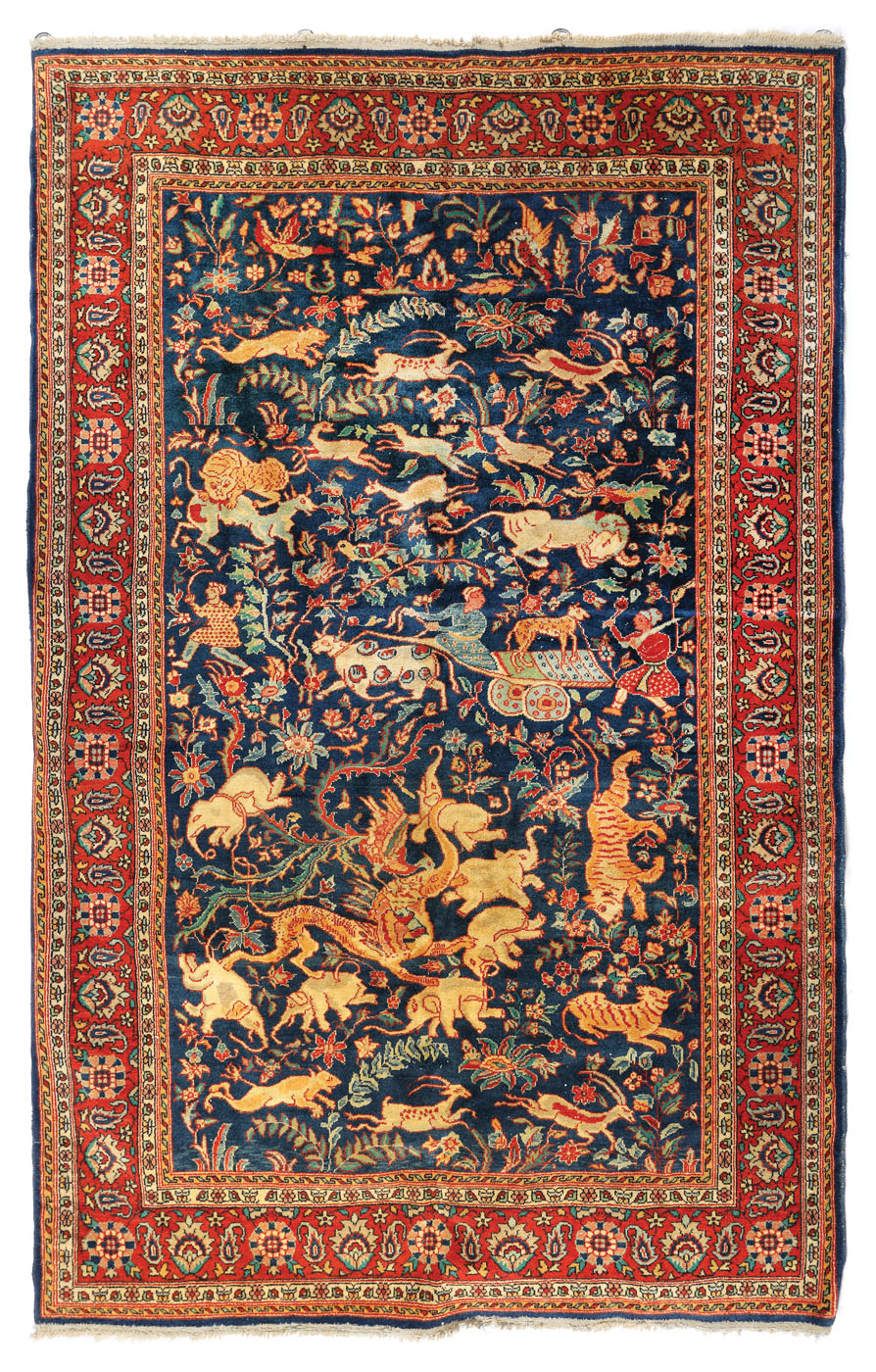 34. Covor Isfahan din lână, decorat cu scene de vânătoare în pădurea sălbatică, Iran, sec. XX