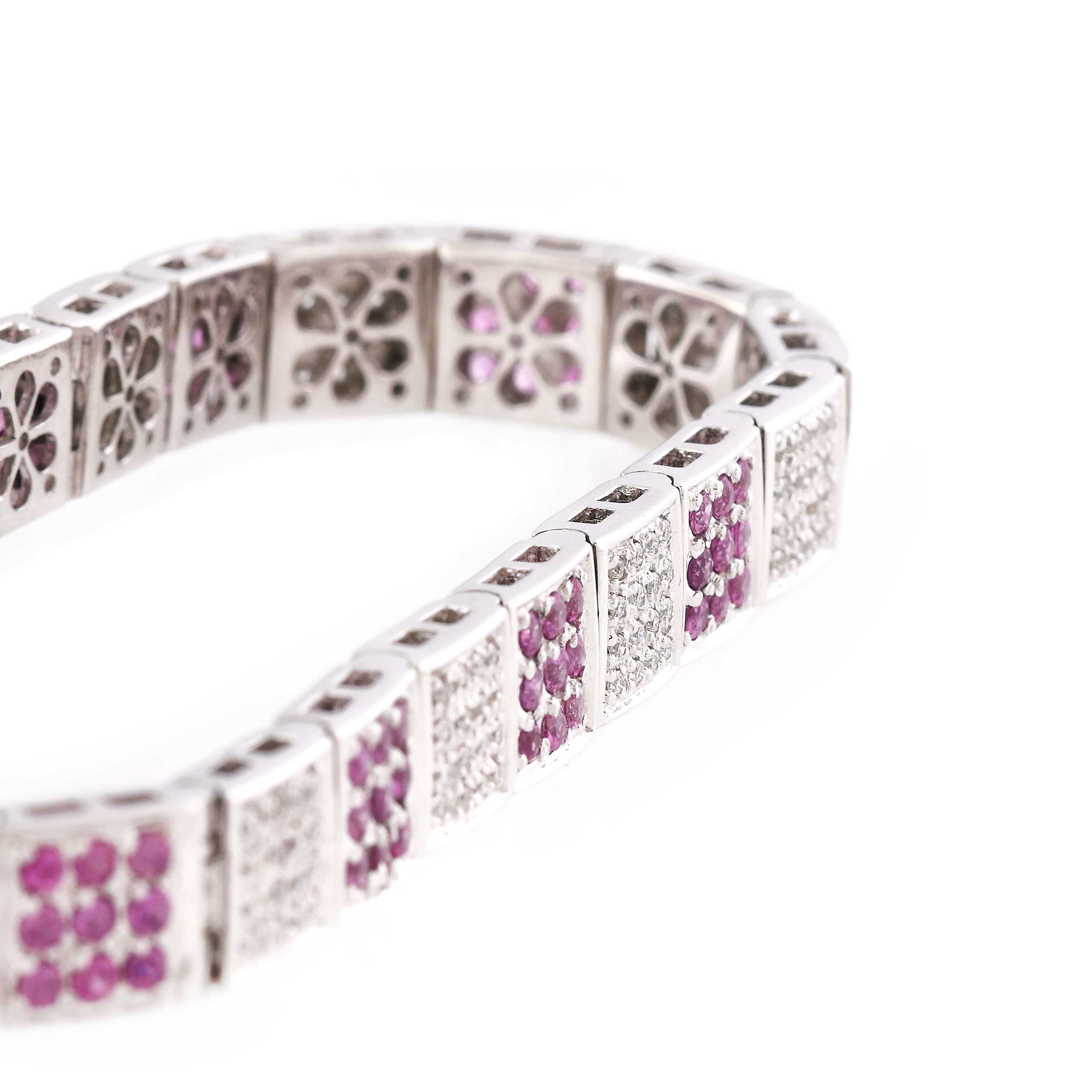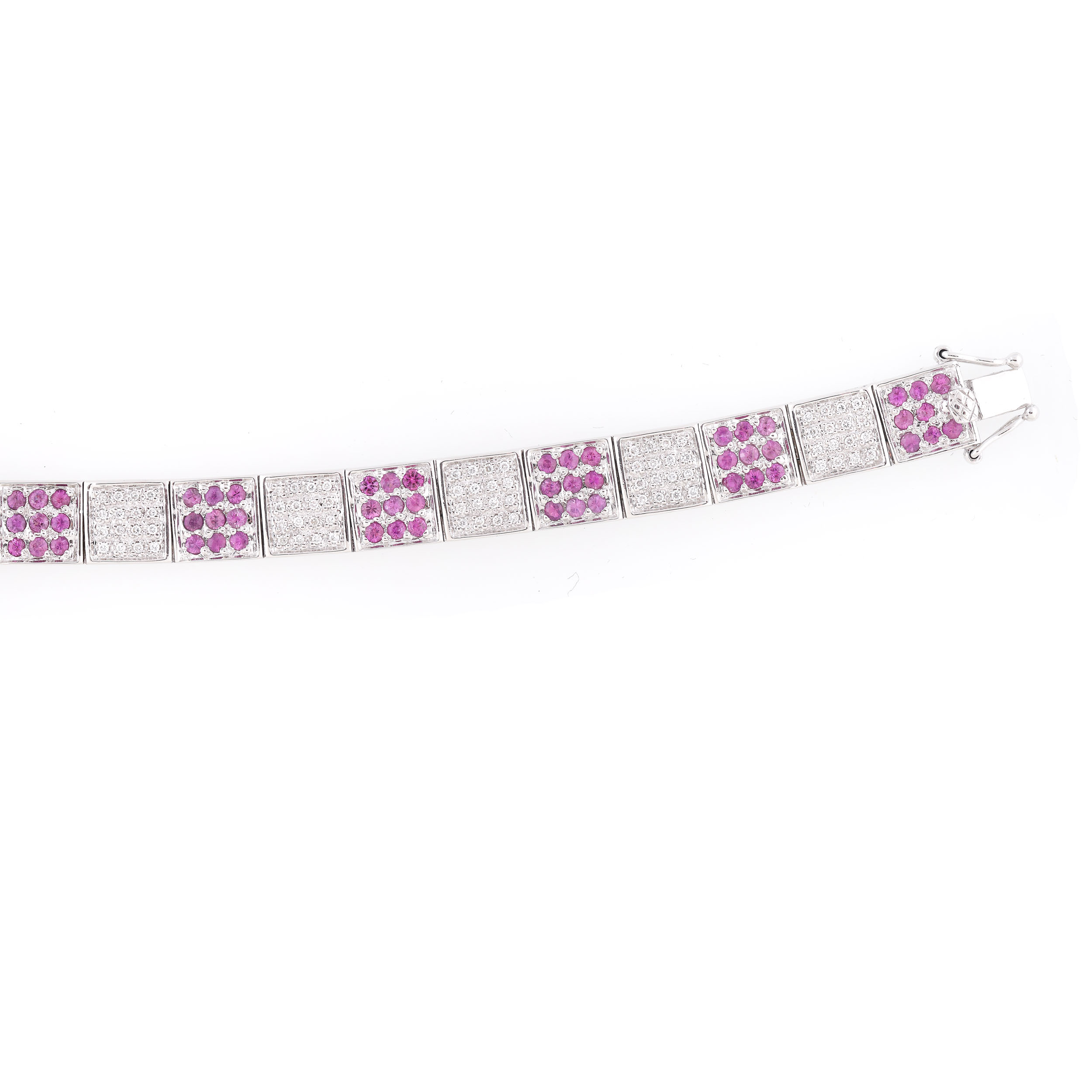 253. Brățară din aur alb, decorată cu pavaj de diamante și safire roz