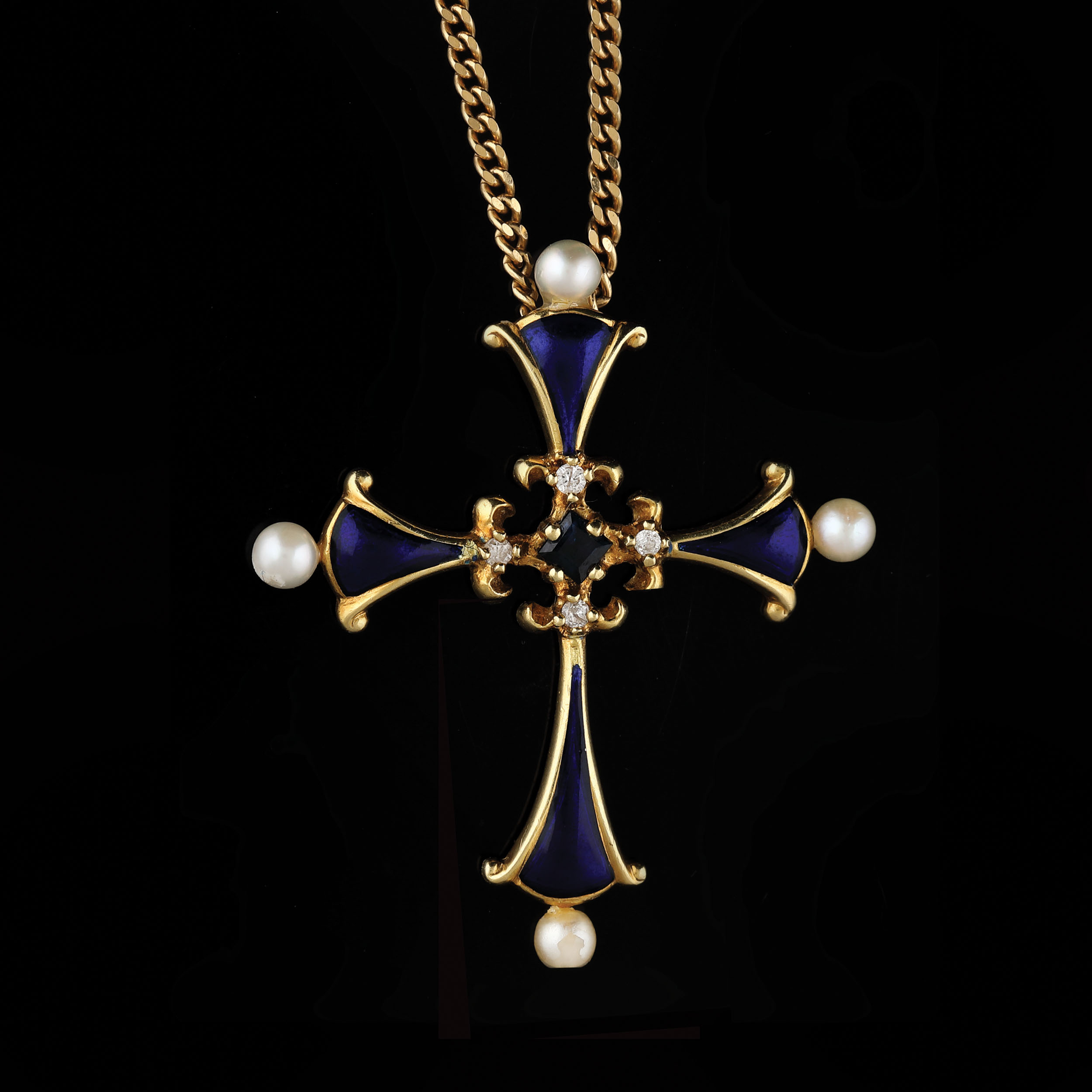 260. Lanț cu pandantiv-cruce Igor Carl Faberge, din aur, decorat cu email, safir, diamante și perle