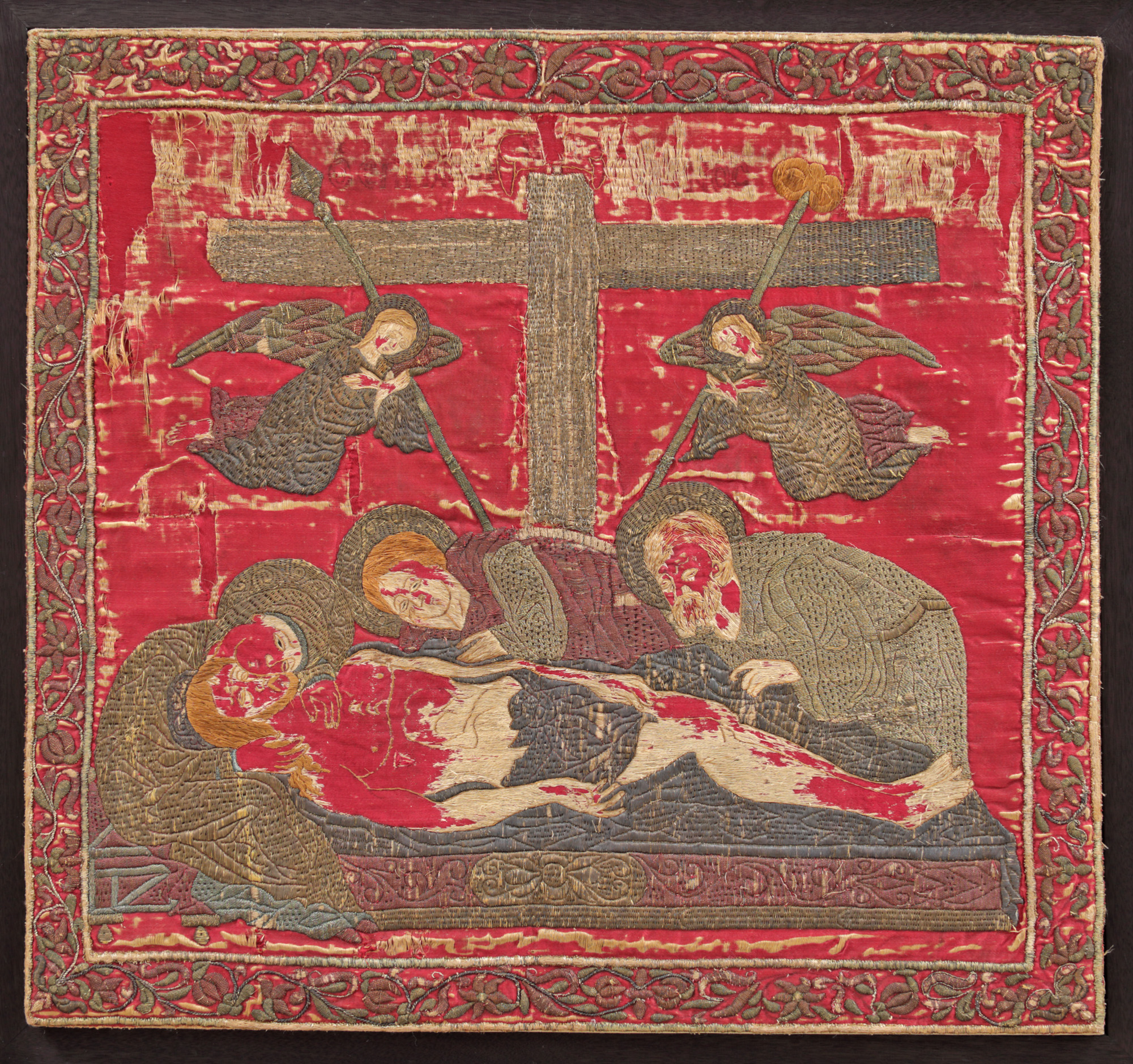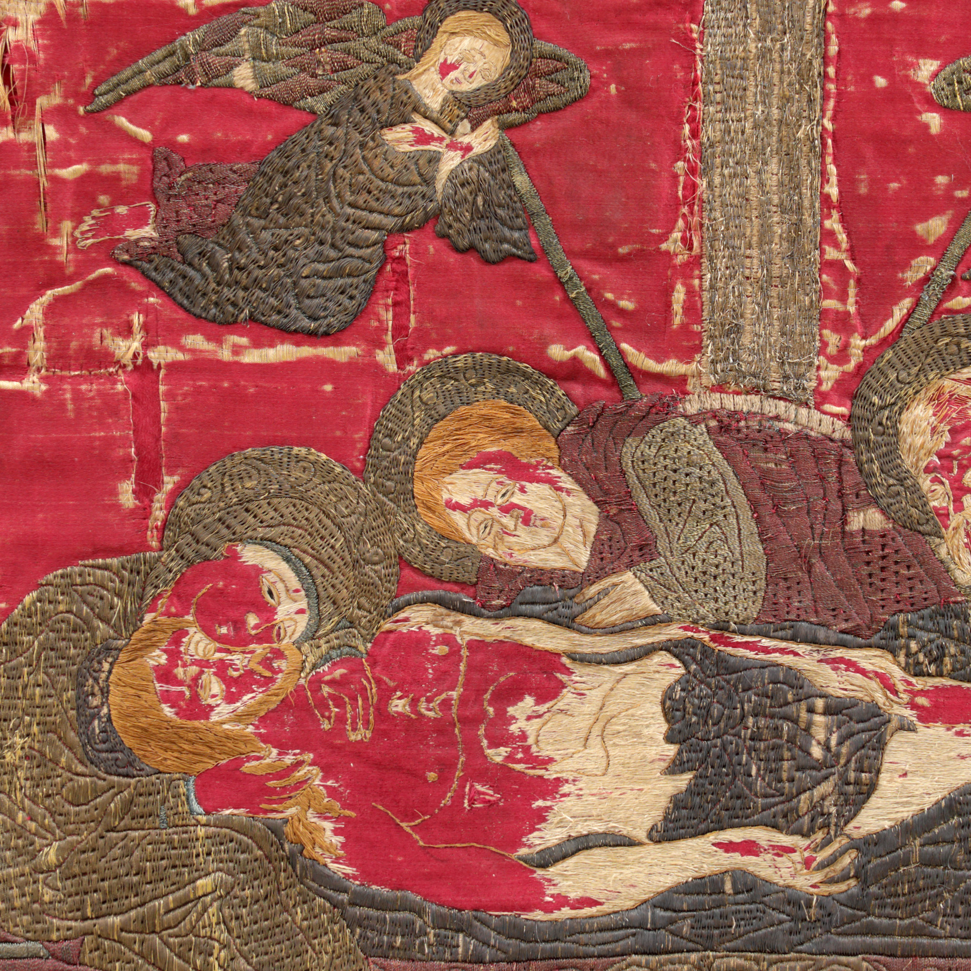 În partea centrală a Aerului este redată scena Plângerii Domnului redusă la elementele esențiale. Iisus Hristos mort este întins pe piatra din Efes. Maica Domnului așezată la căpătâiul său îi ține capul pe genunchi și aplecată deasupra lui, îl îmbrățișează. Chipul Fecioarei exprimă o durere profundă, dar stăpânită. În partea stângă a lui Iisus, Sf. Ioan Evanghelistul este redat aplecat deasupra lui Iisus, chipul său trădând o durere nestăpânită. Lângă el este și Sf. Nicodim, redat în aceeași atitudine, chipul său trădând aceeași durere copleșitoare. În fundal, în ax de simetrie, este redată Crucea Răstignirii. Doi îngeri în zbor, plângând, poartă semnele Patimilor lui Iisus: sulița cu care a fost stăpuns și buretele îmbibat în oțet în loc de apă. Scena este delimitată de un chenar îngust decorat cu motive vegetale compus dintr-un vrej meandric cu flori și frunze.