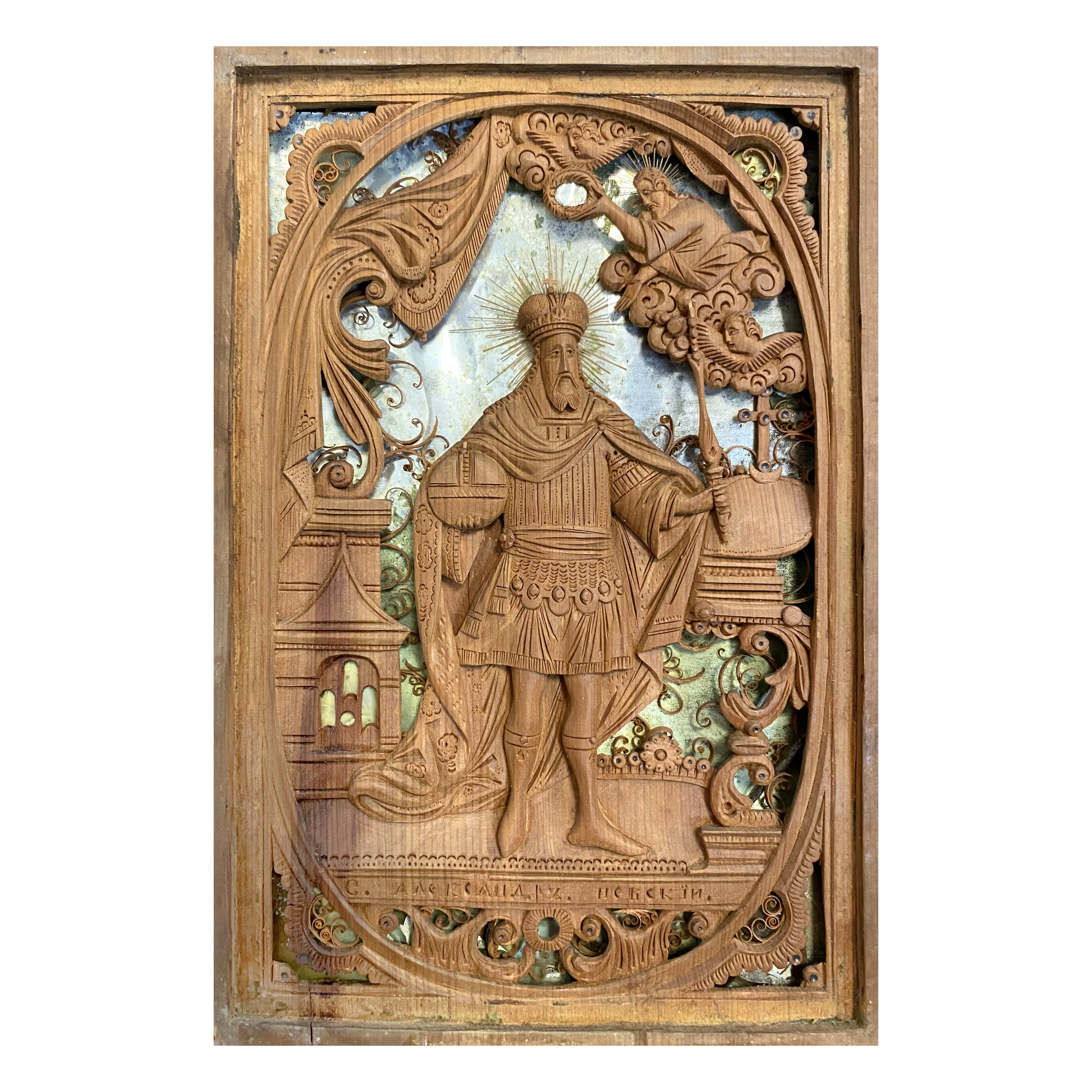 56. Icoană din lemn sculptat, ”Sfântul Alexandru Nevsky, Prinț de Novgorod”, școală rusească, sec. XIX, de colecție