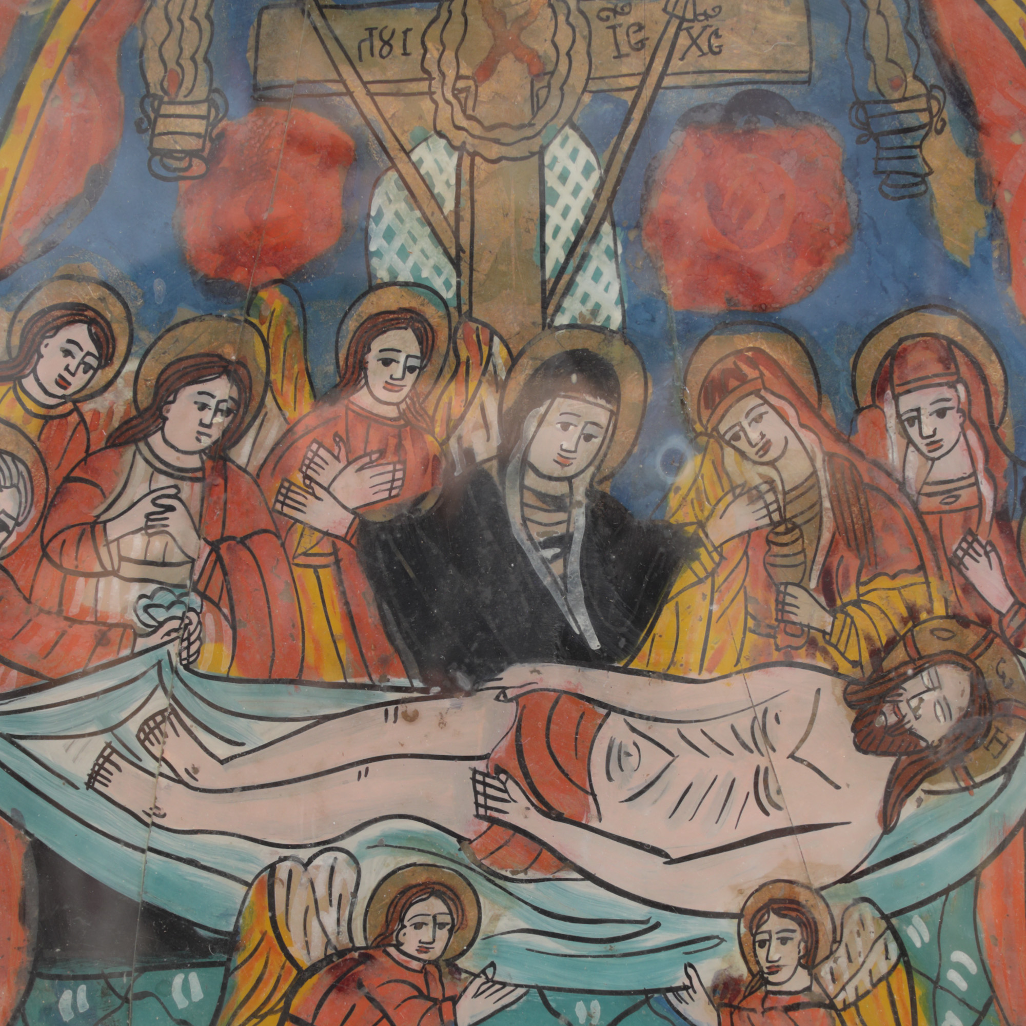 1. Icoană pe glajă, ”Coborârea de pe Cruce”, atelier din Șcheii Brașovului, a doua jumătate a sec. XIX