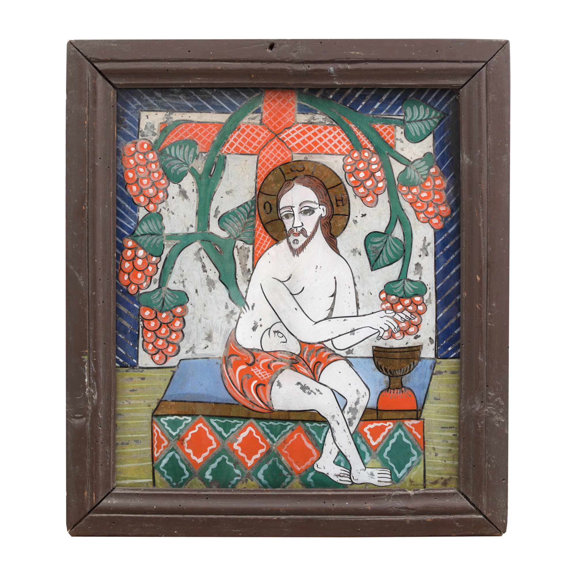 Așezat pe o ladă decorată, în partea inferioară cu romburi, Iisus stoarce, într-un potir, strugurii viței crescute din coasta Sa. În fundal, se profilează Crucea Răstignirii. Partea superioară a fundalului este albă, cea inferioară fiind decorată cu linii paralele verticale. Chenarul este format din benzi albastre și albe poziționate diagonal, în stilul specific zugravilor din familia Grecu. (M.B.)