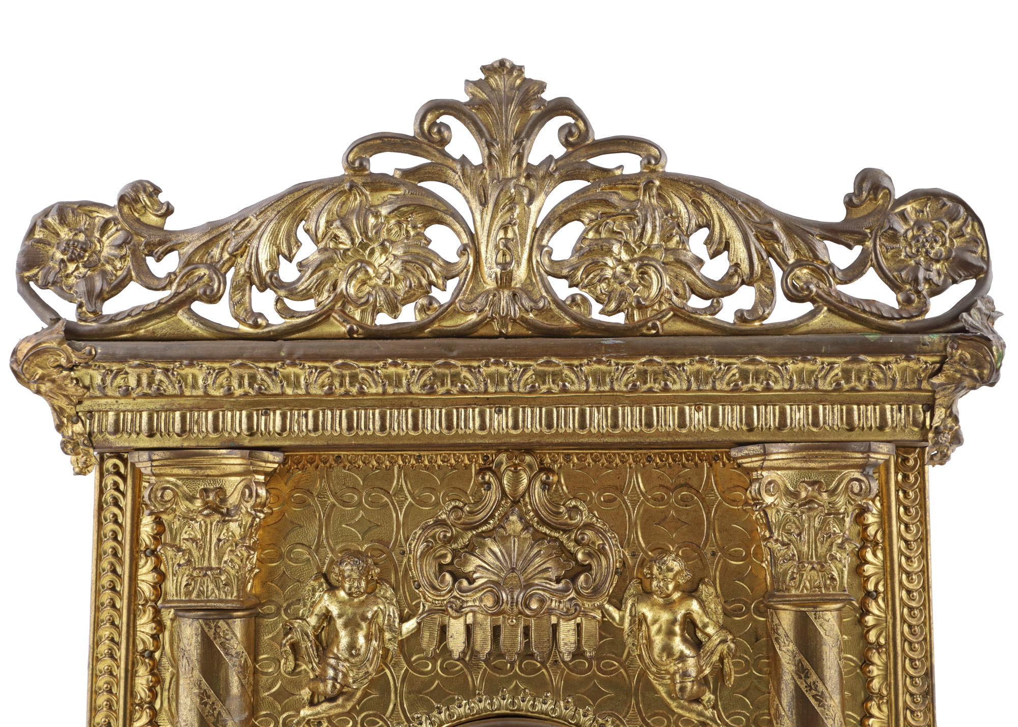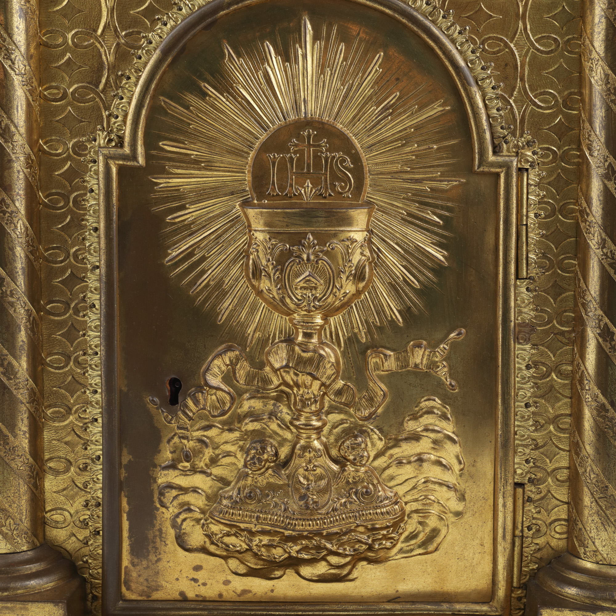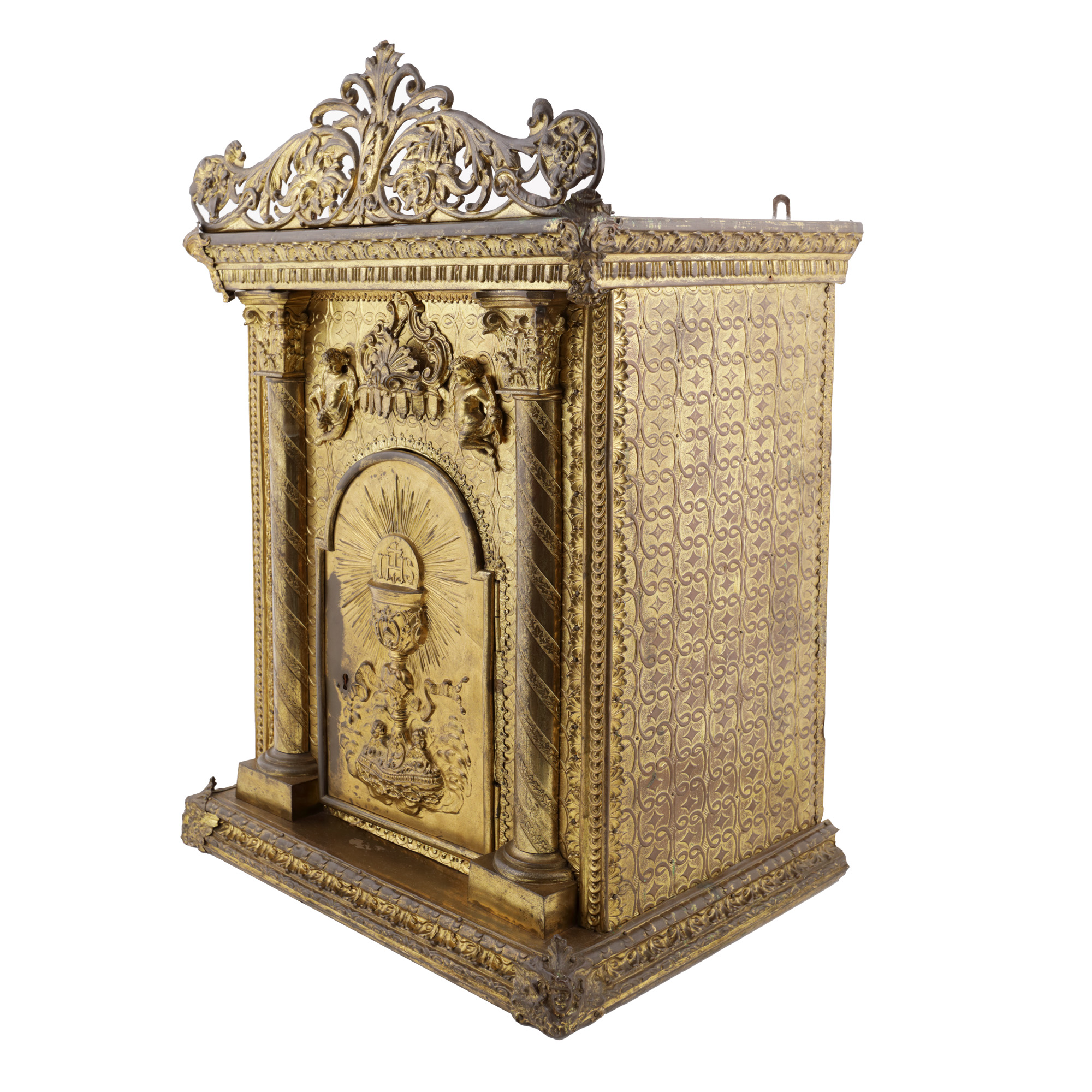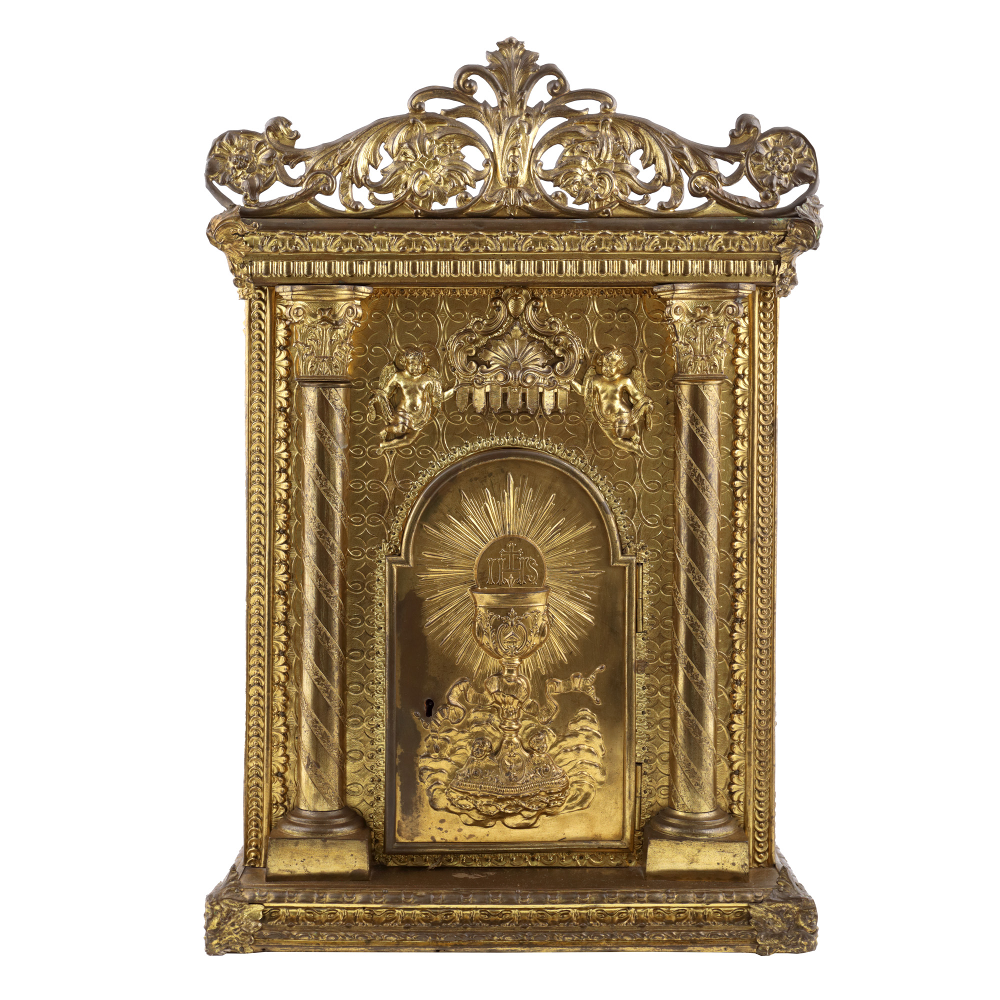 60. Splendid chivot Neo-baroc, din alamă aurită, decorat cu pocalul euharistic, îngeri și coloane grecești, sec. XIX, piesă rară