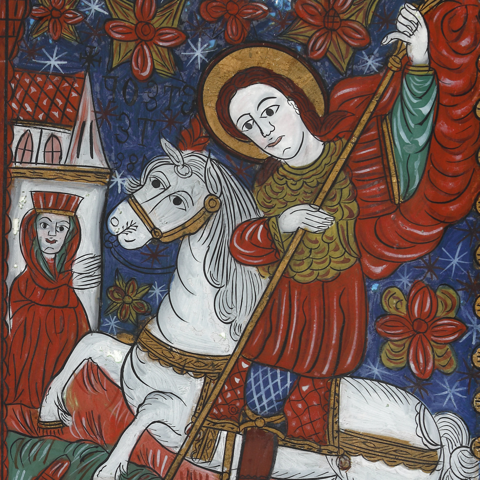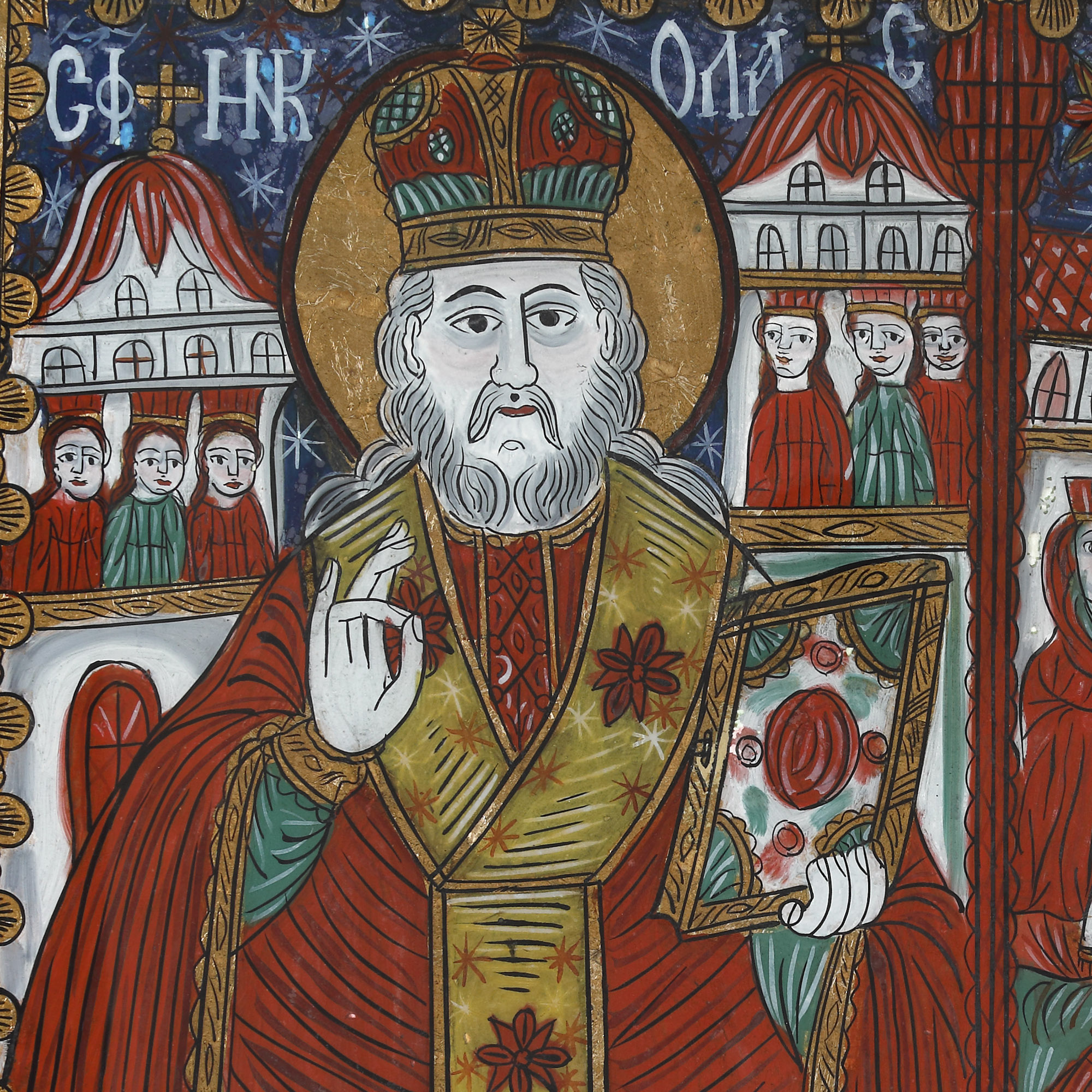 24. Icoană pe glajă, în două registre, ”Sfântul Ierarh Nicolae și Sfântul Gheorghe omorând balaurul”, atelierul familiei Tămaș din Făgăraș, probabil Petru Tămaș-fiul, a doua jumătate a sec. XIX