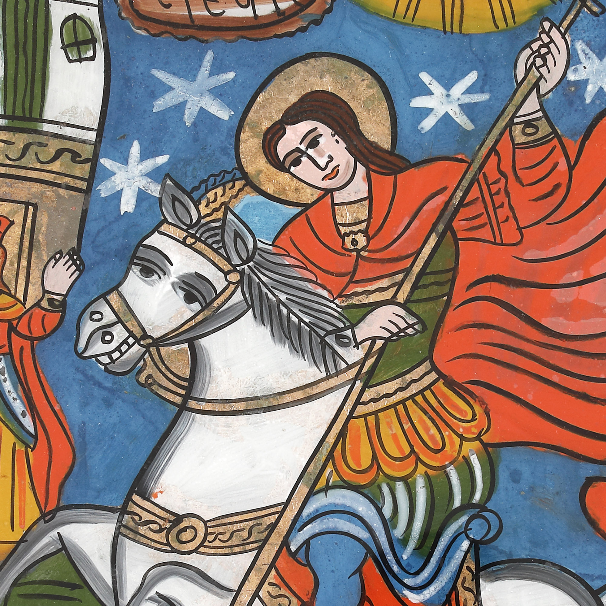 7. Icoană pe glajă, ”Sfântul Gheorghe omorând balaurul”, atelier din Șcheii Brașovului, a doua jumătate a sec. XIX