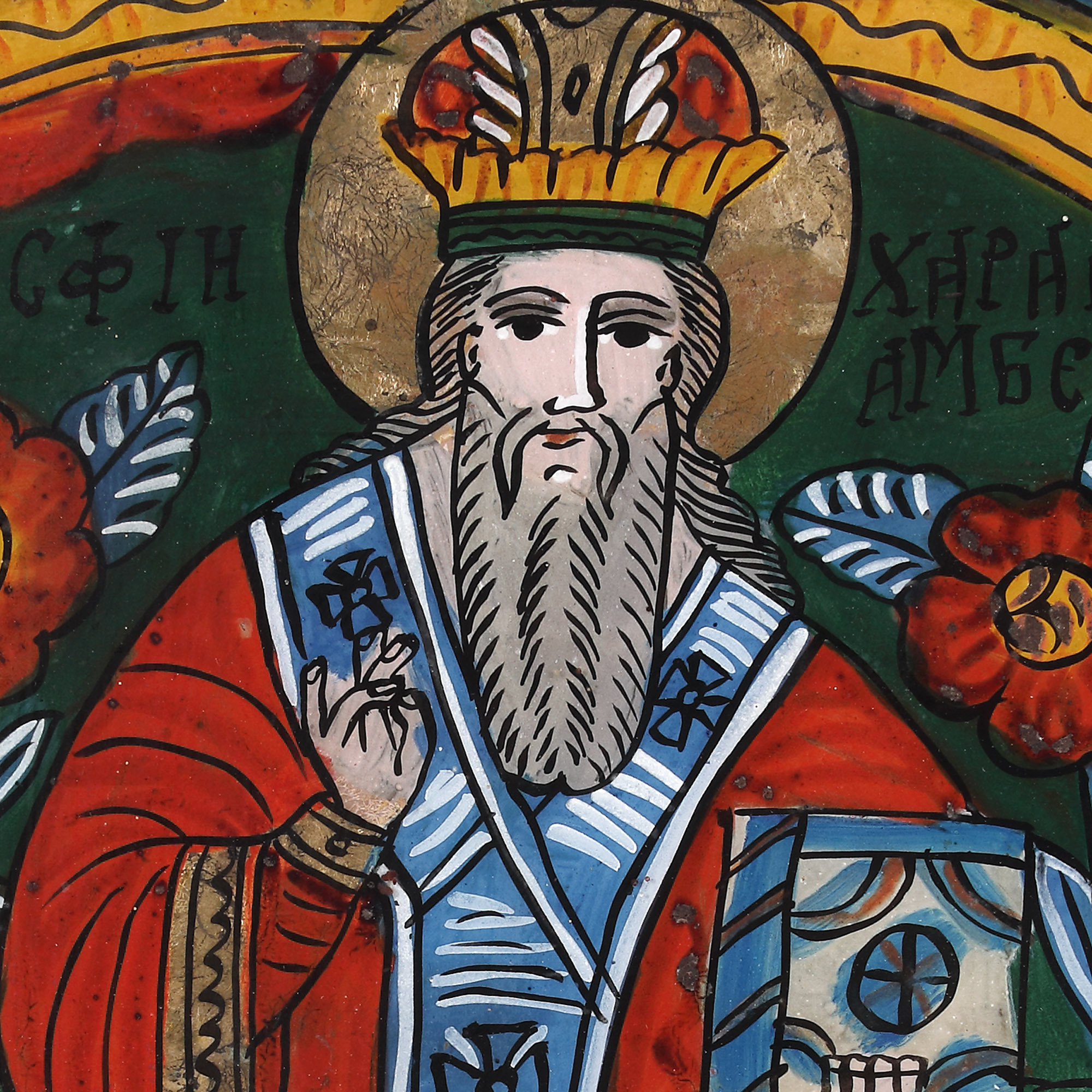 33. Icoană pe glajă, "Sfântul Haralambie izbăvitorul de ciumă", atelier din Șcheii Brașovului, a doua jumătate a sec. XIX
