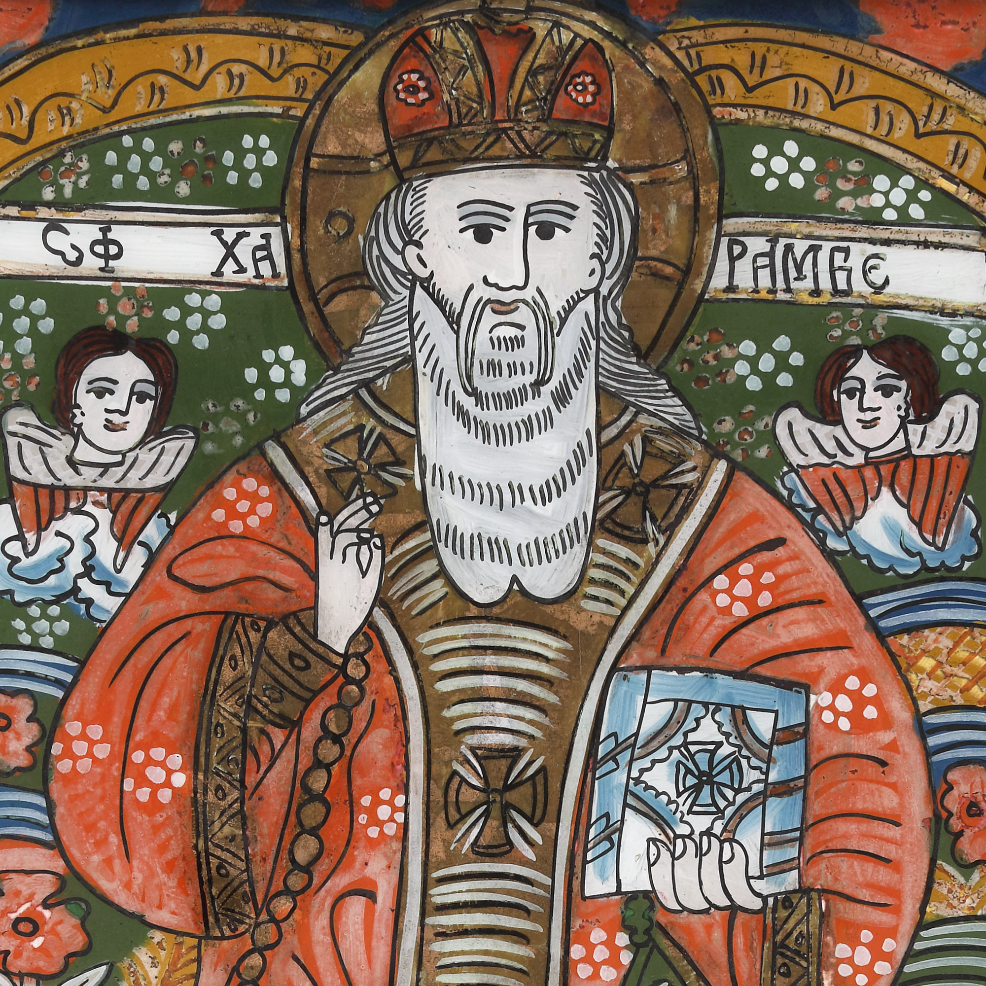31. Icoană pe glajă, ”Sfântul Haralambie legând ciuma”, atelier din Șcheii Brașovului, ultimele decenii ale sec. XIX