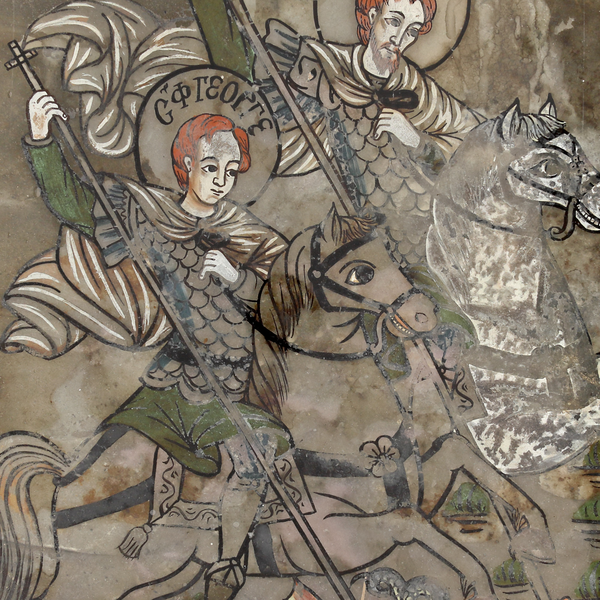 16. Icoană pe glajă, ”Sfinții Militari Gheorghe și Teodor Tiron”, zugrav Ioan Pop, Făgăraș, prima jumătate a sec. XIX, piesă rară, de colecție