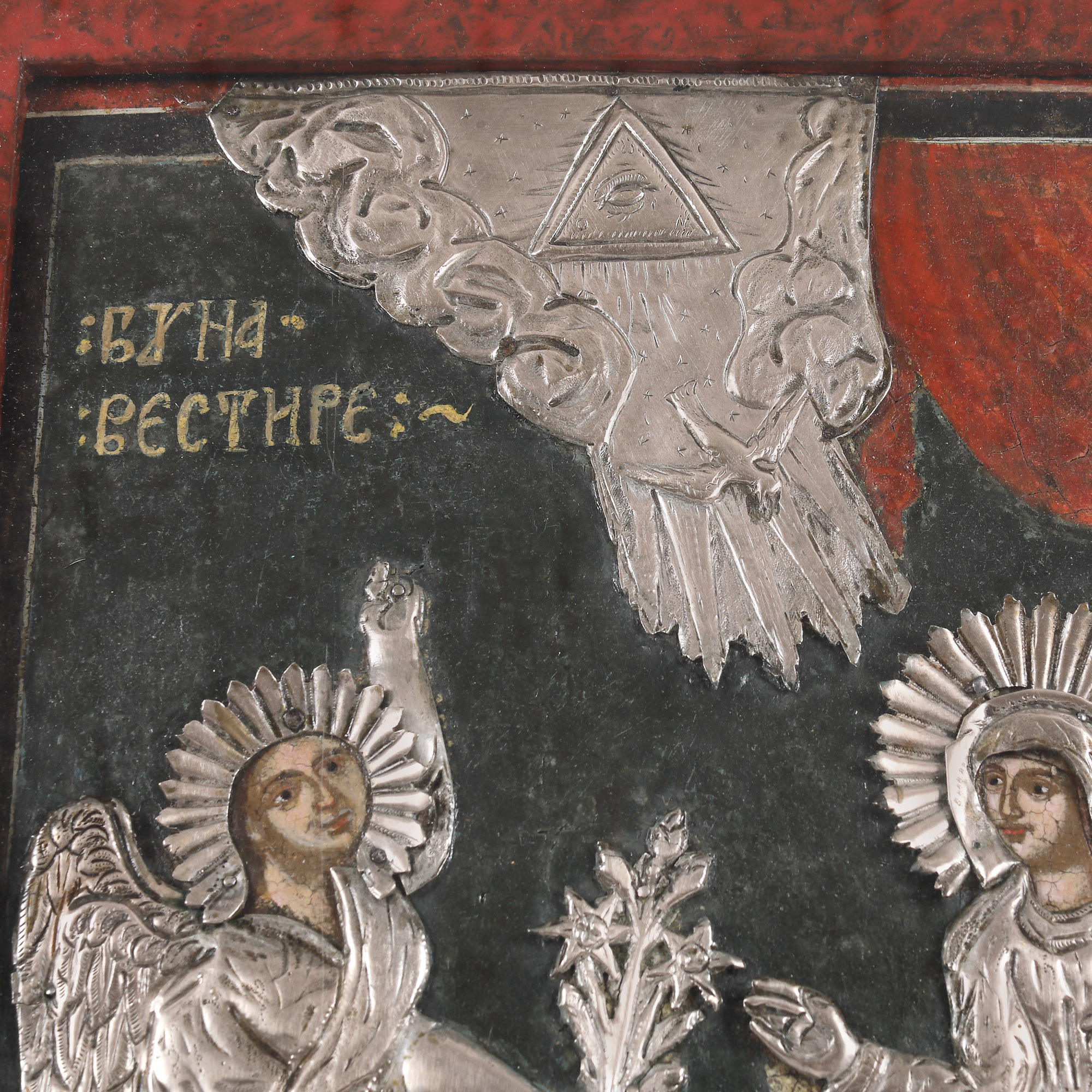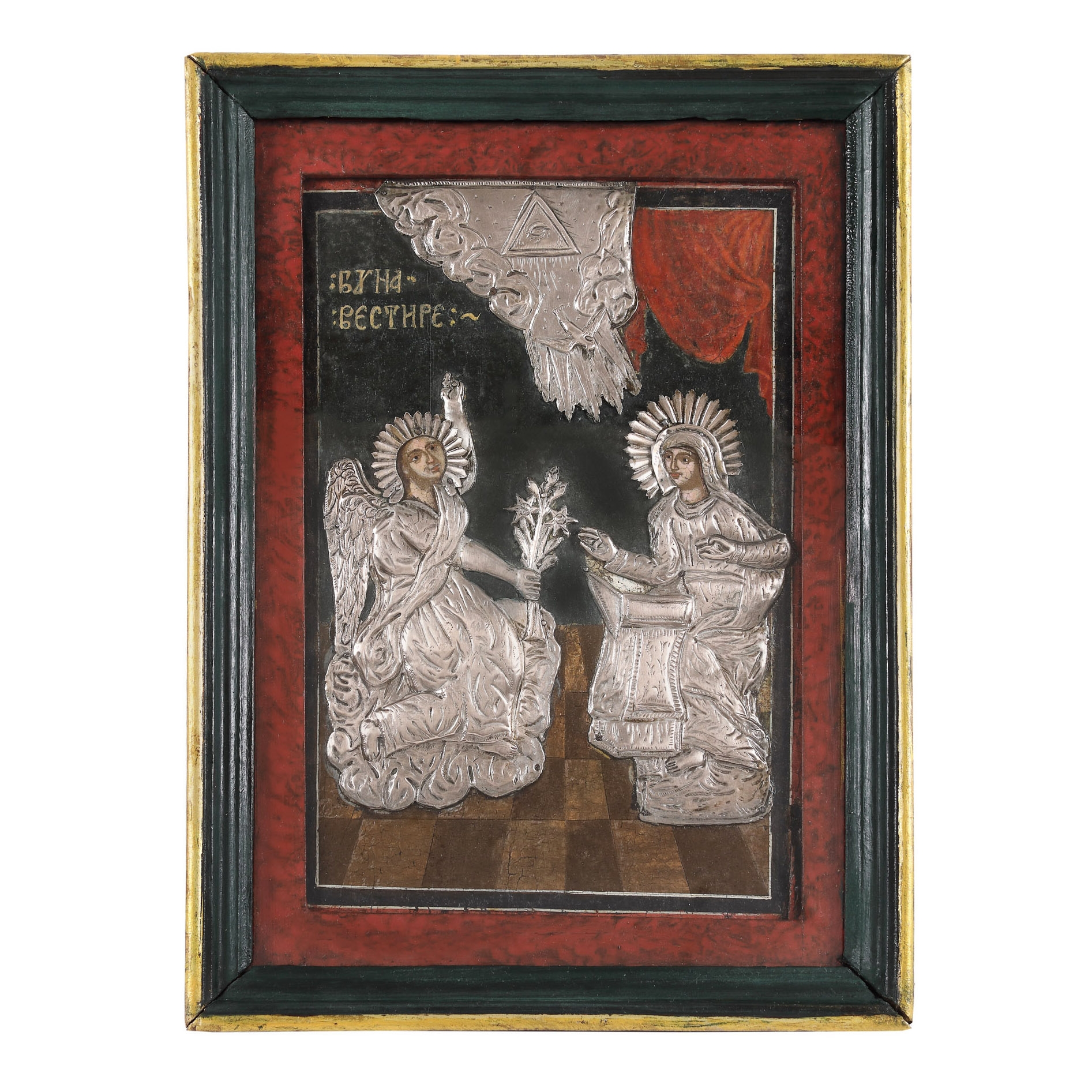 43. Icoană pe lemn, cu riză, ”Buna Vestire”, școală românească de tranzitie, prima jumătate a sec. XIX