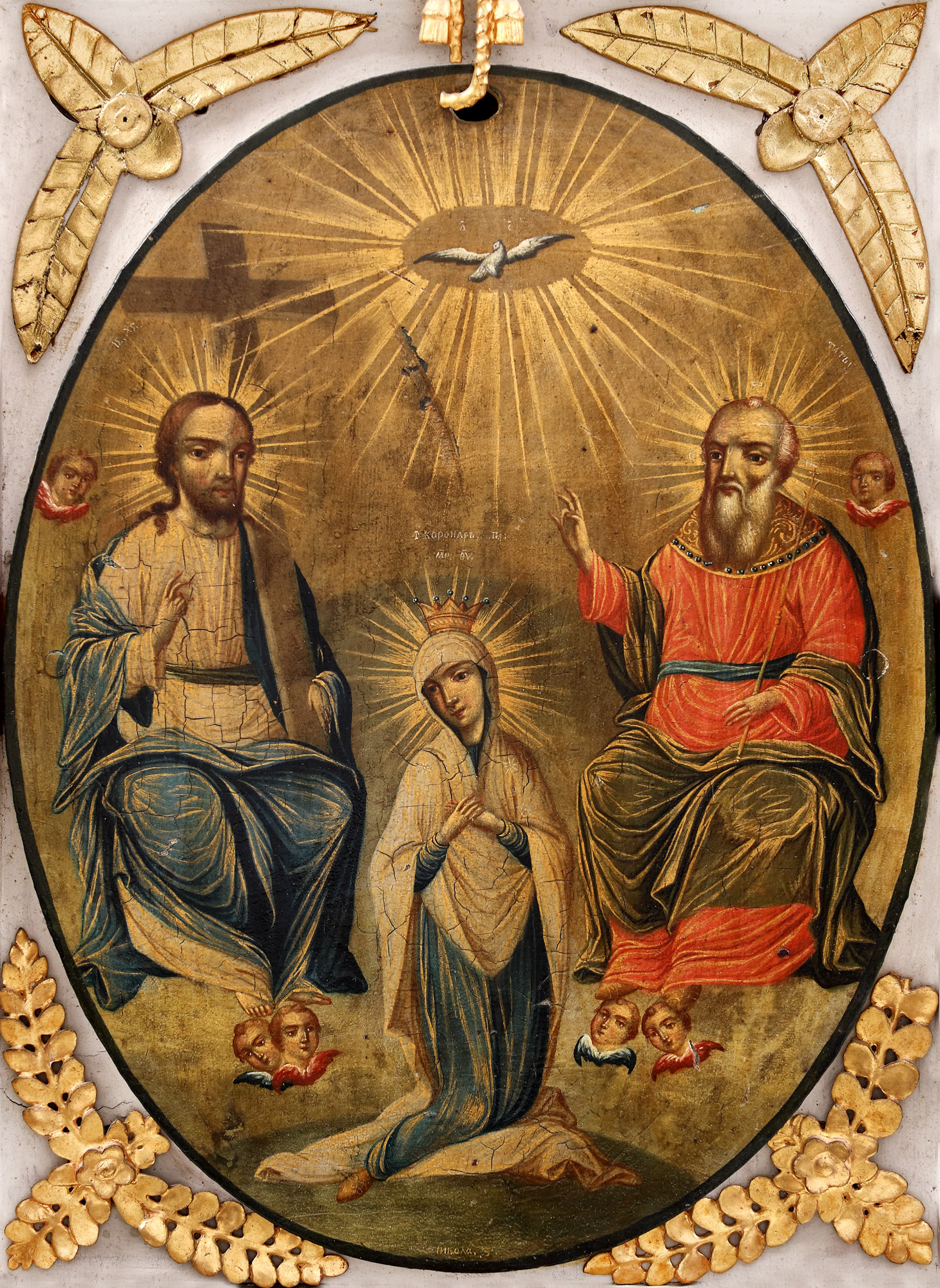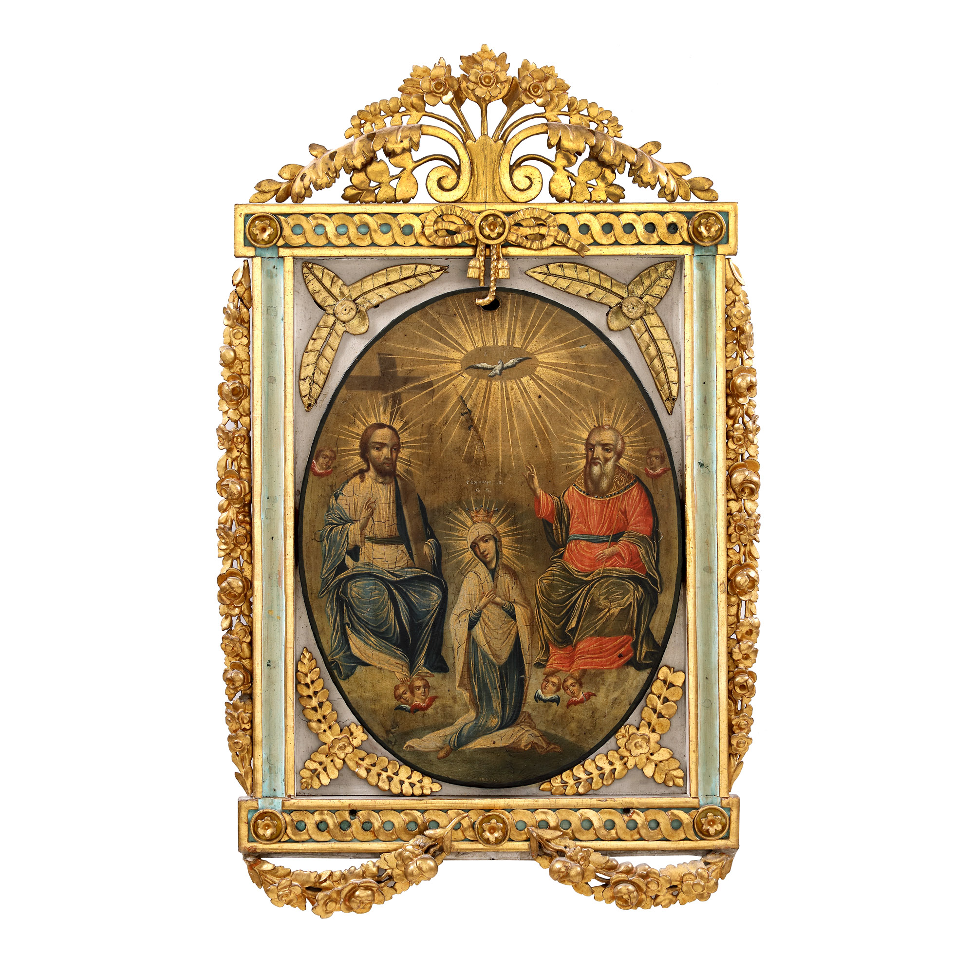 42. Icoană pe lemn, ”Încoronarea Maicii Domnului (Sfânta Troiță)”, ramă sculptată, zugrav Nicolae, jumătatea sec. XIX, de colecție