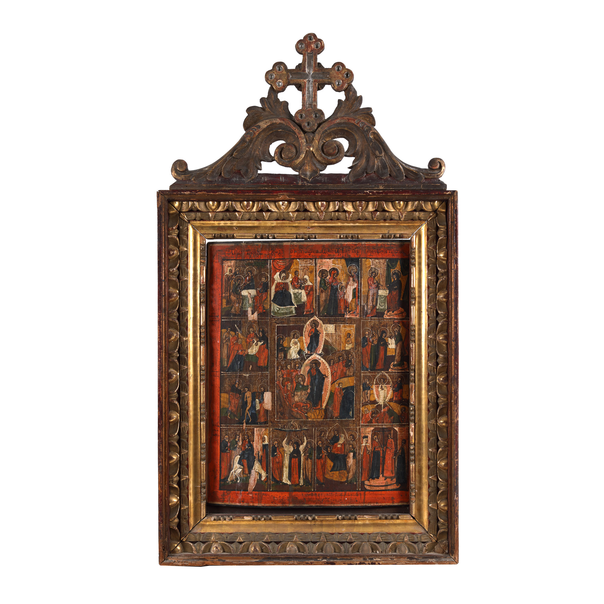 52. Icoană pe lemn, "Învierea Domnului și 12 scene”, ramă sculptată, școală rusească, jumătate sec. XIX