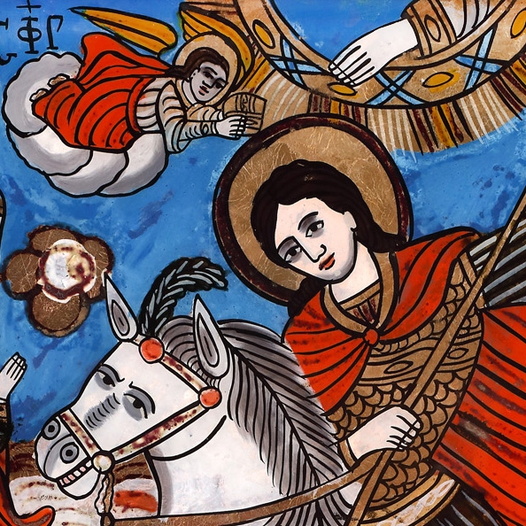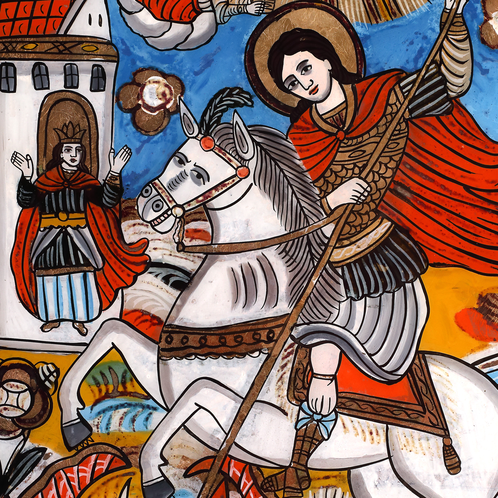 15. Icoană pe glajă, "Sfântul Gheorghe ucigând balaurul", atelier din Șcheii Brașovului, jumătătea sec. XIX, piesă de colecție