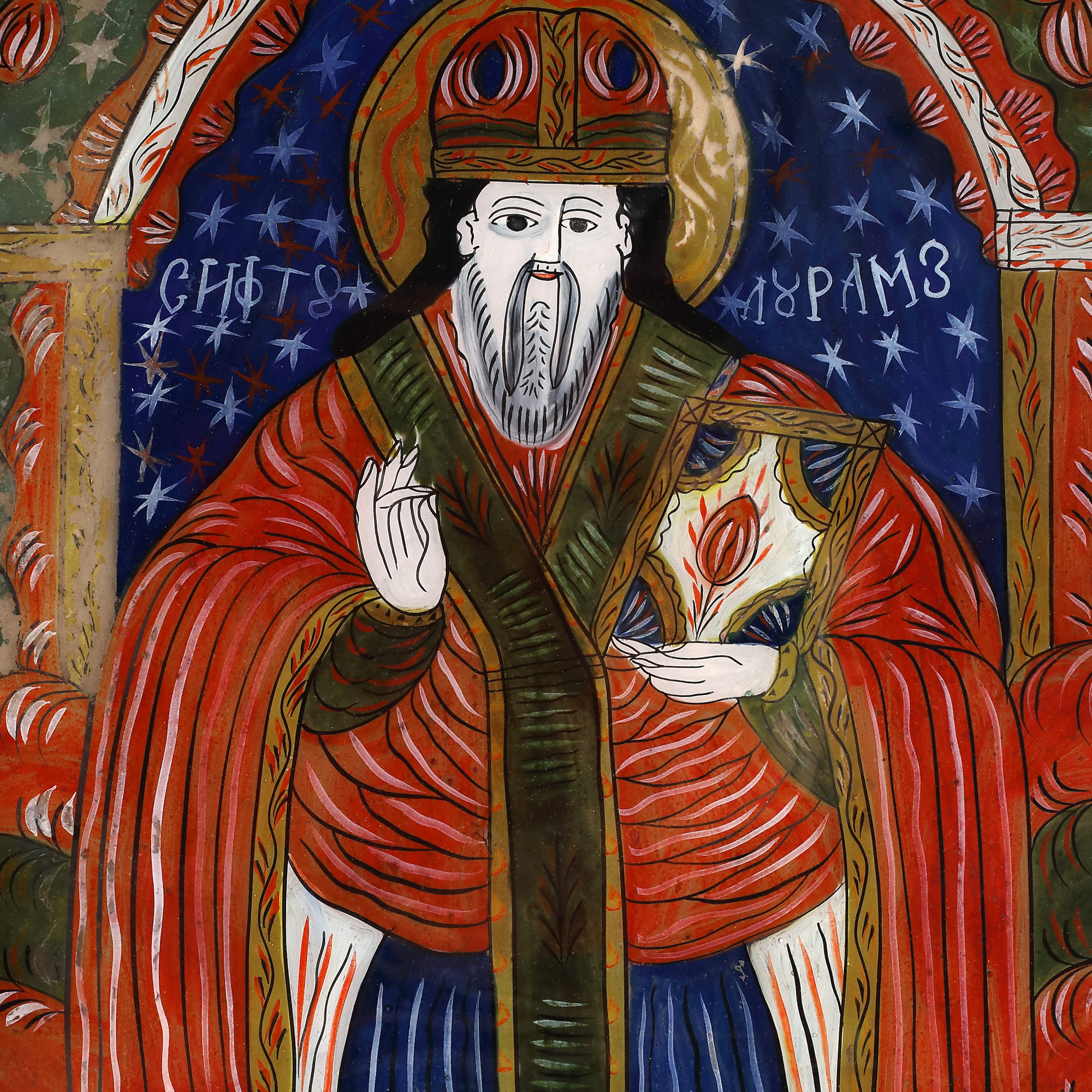 34. Icoană pe glajă, ”Sfântul Haralambie înlânțuind ciuma", atelierul familiei Tămaș din Făgăraș, probabil Petru Tămaș-fiul, a doua jumătate a sec. XIX