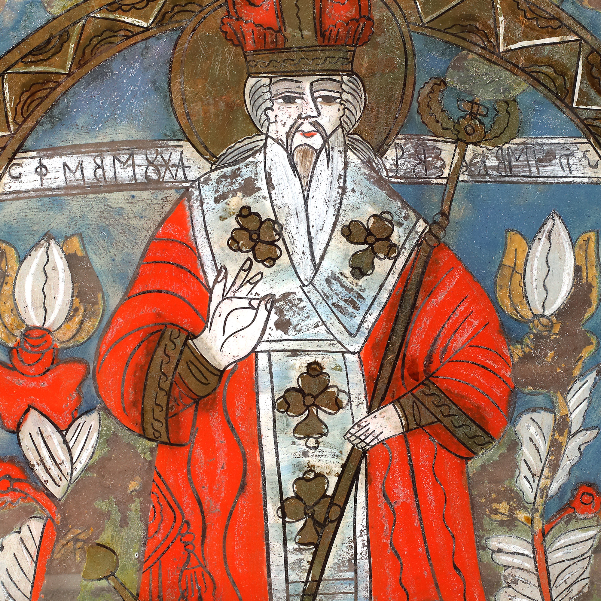 18. Icoană pe glajă, "Sfântul Haralambie izbăvitorul de ciumă", atelier din Șcheii Brașovului, a doua jumătate a sec. XIX