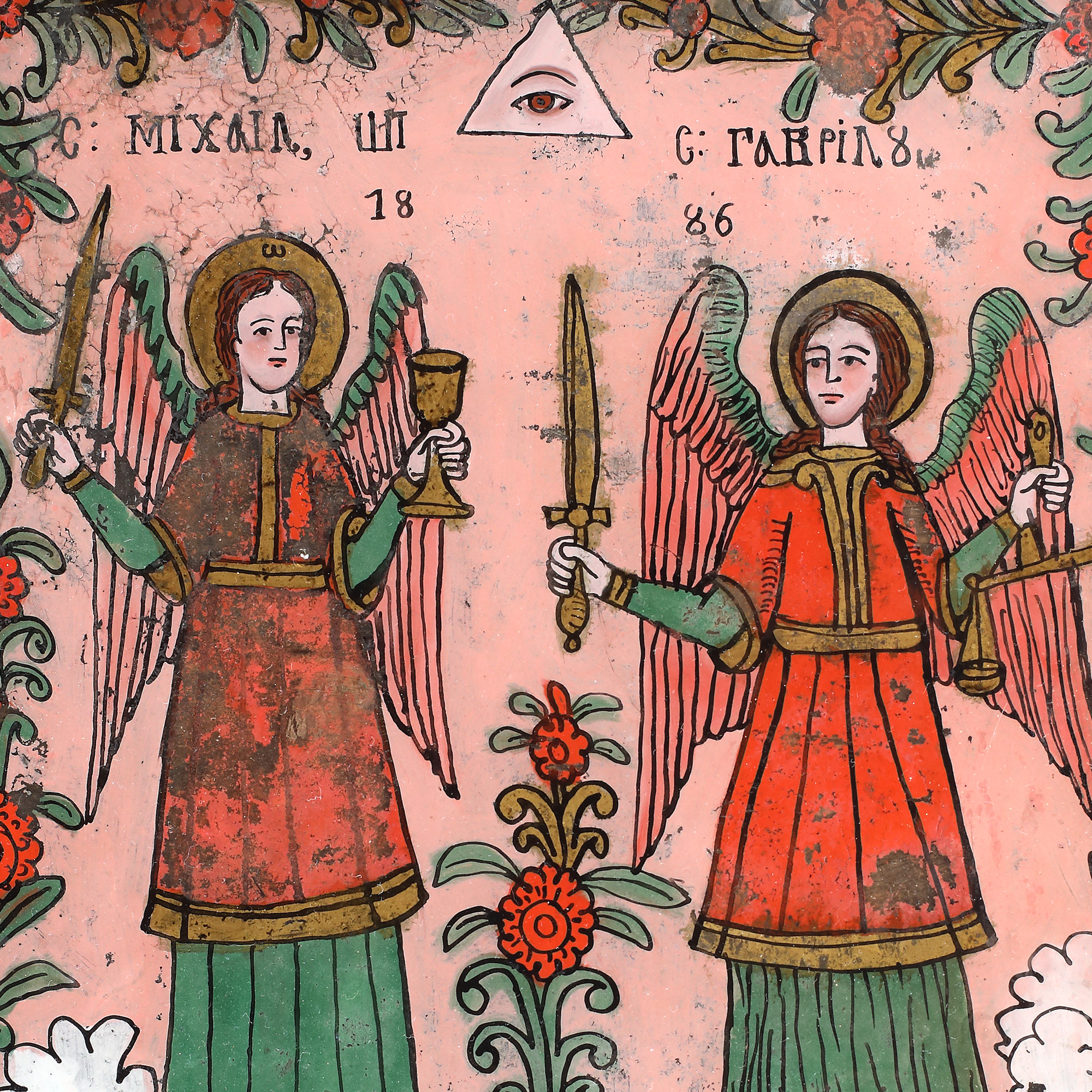 4. Icoană pe glajă, ”Sfinții Arhangheli Mihail și Gavril”, atribuit zugrav Matei Țâmforea, Cârțișoara, 1886, piesă extrem de rară, de colecție