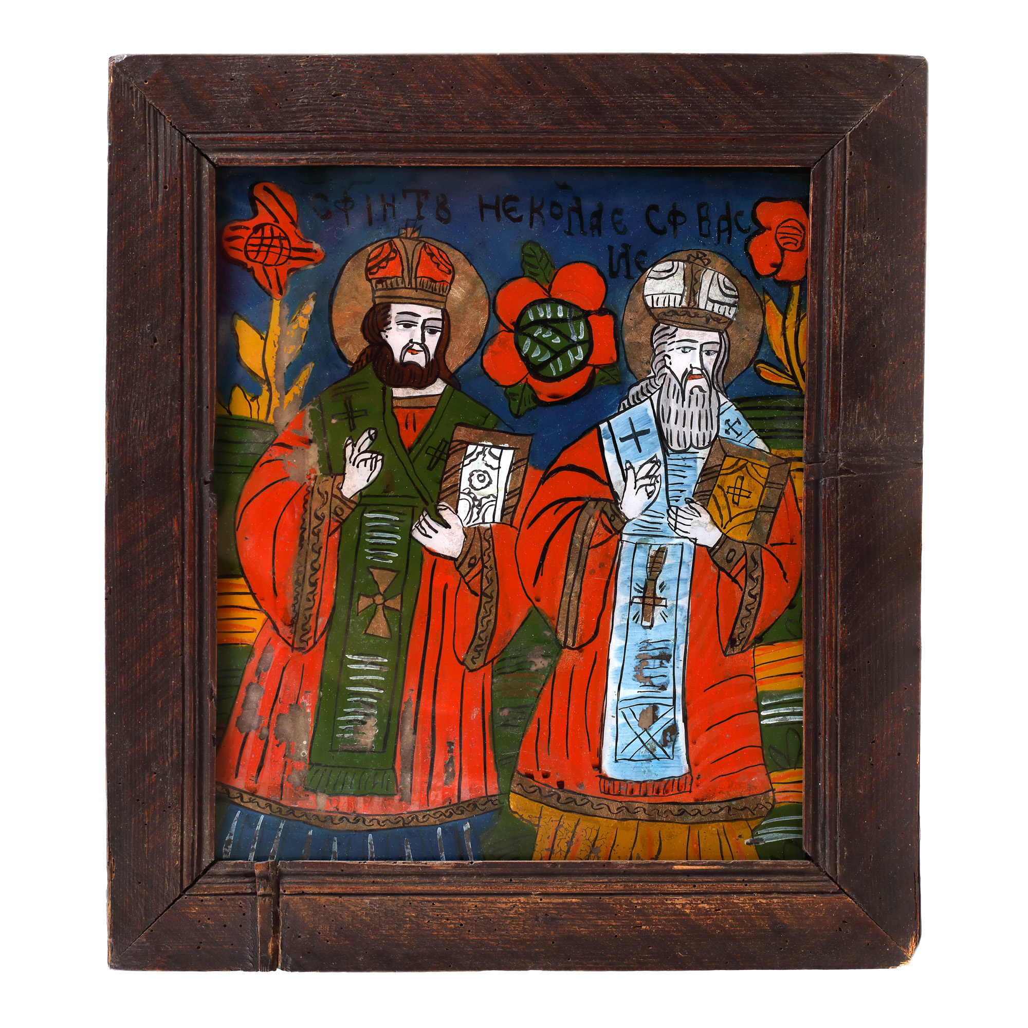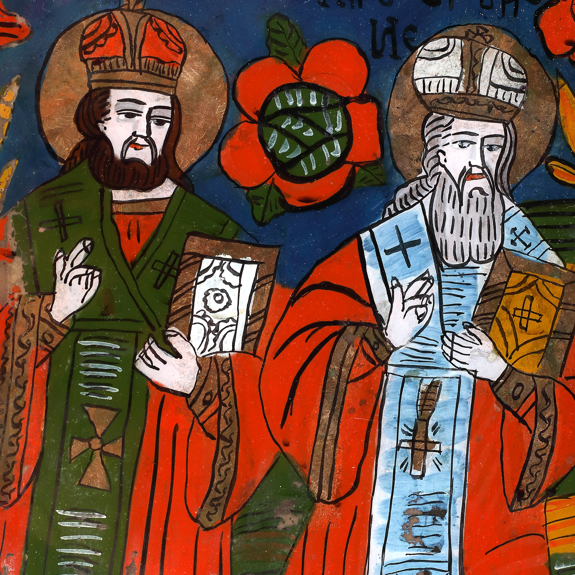 39. Icoană pe glajă, "Sfinții Ierarhi Nicolae și Vasile", atelier din Șcheii Brașovului, a doua jumătate a sec. XIX