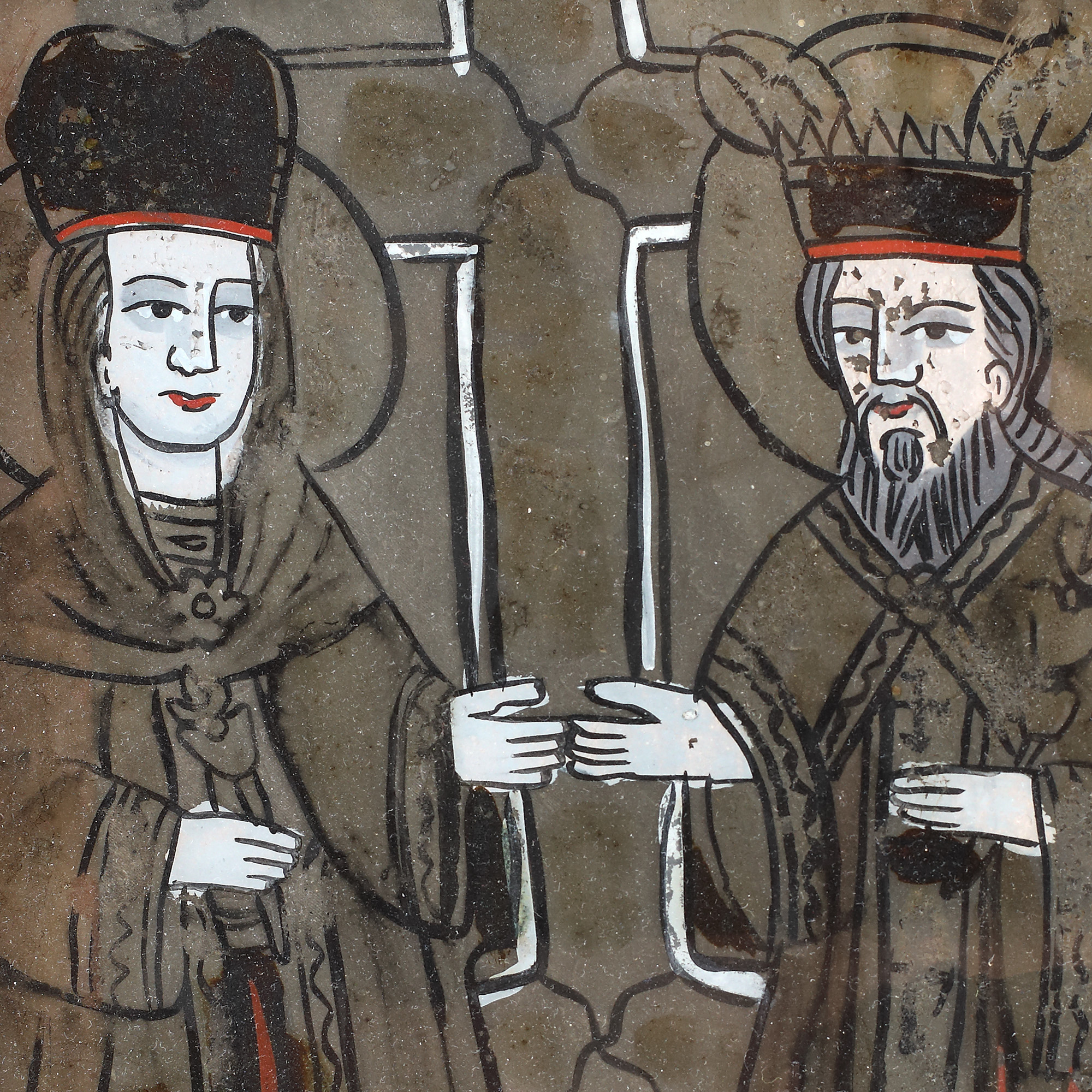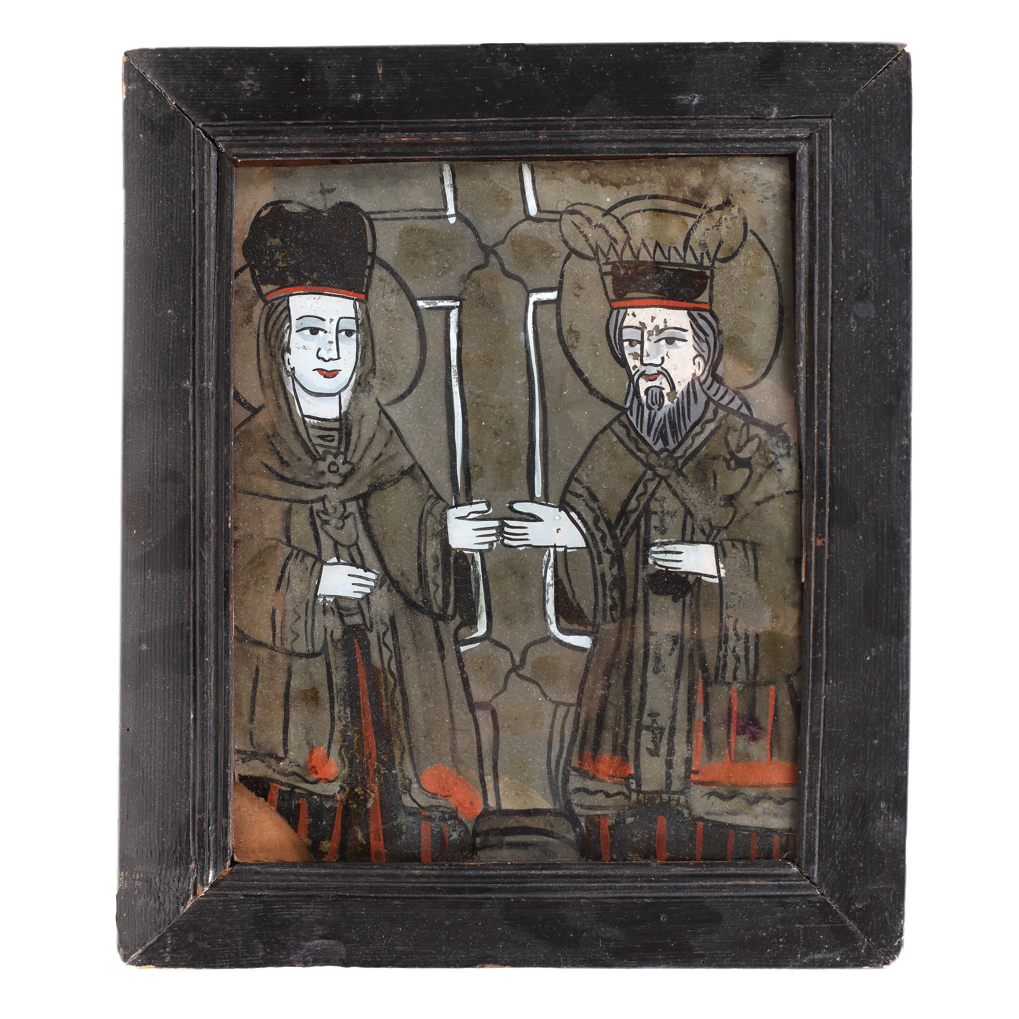 42. Icoană pe glajă, ”Sfinții Împărați Constantin și Elena”, atelier din Șcheii Brașovului, jumătatea sec. XIX, piesă rară