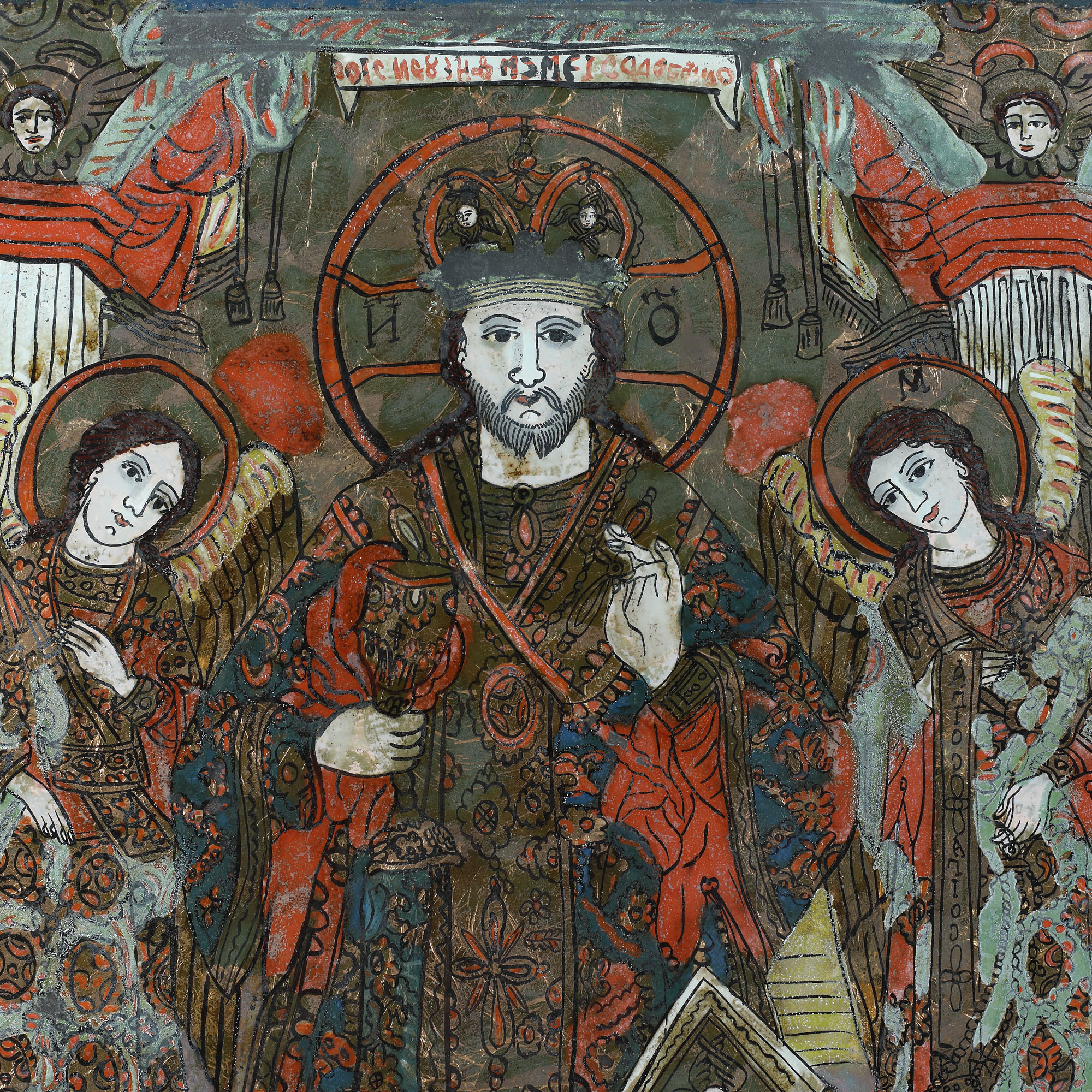 12. Icoană pe glajă, ”Iisus Hristos Împărat și Mare Arhiereu, flancat de arhangheli”, atelier din Țara Bârsei, a doua jumătate a sec. XIX, piesă de colecție
