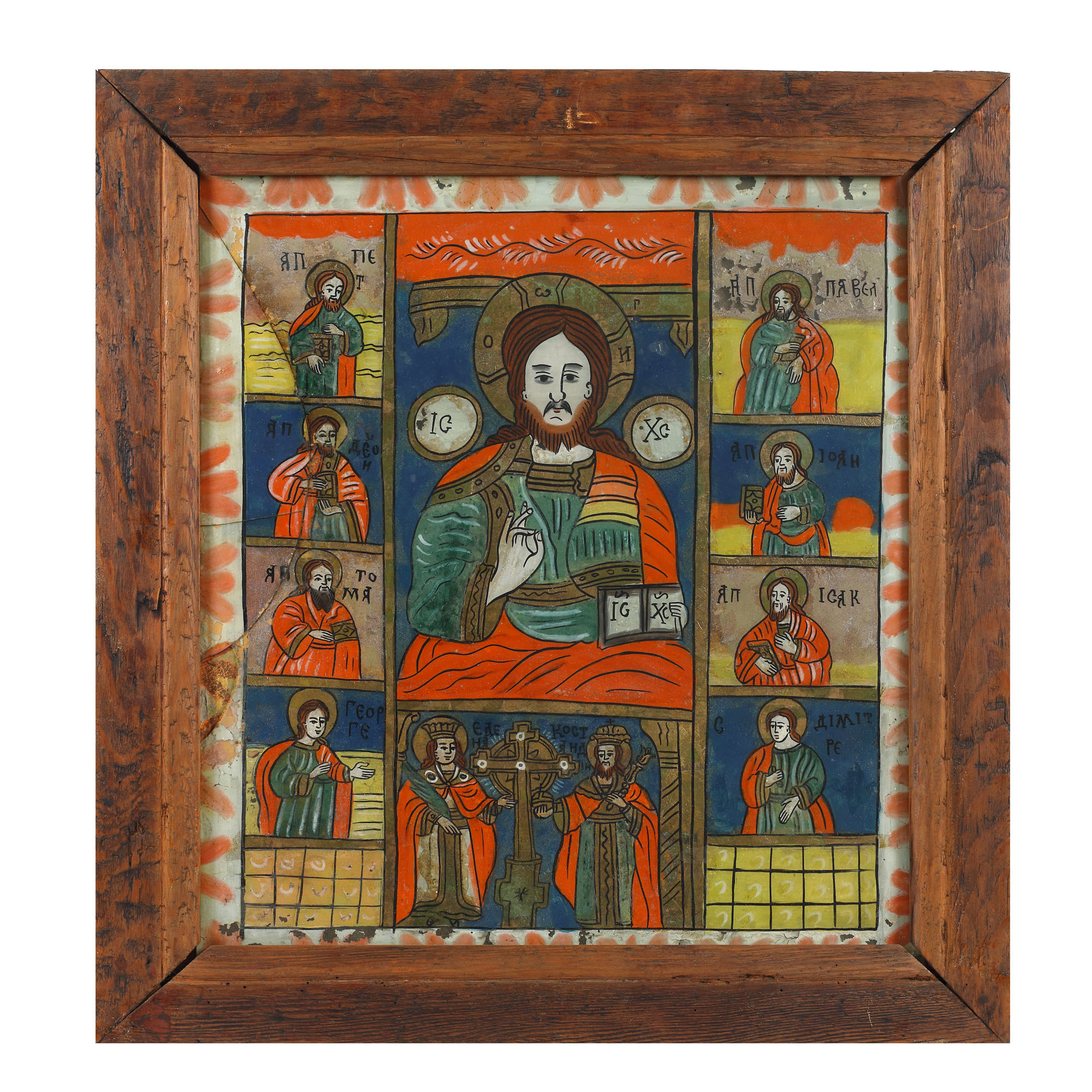 39. Icoană pe glajă, "Iisus Învățător, înconjurat de sfinți", atelier din Șcheii Brașovului, a doua jumătate a sec. XIX, piesă rară, provine din colecția familiei ieșene Leon Sculy Logotheti