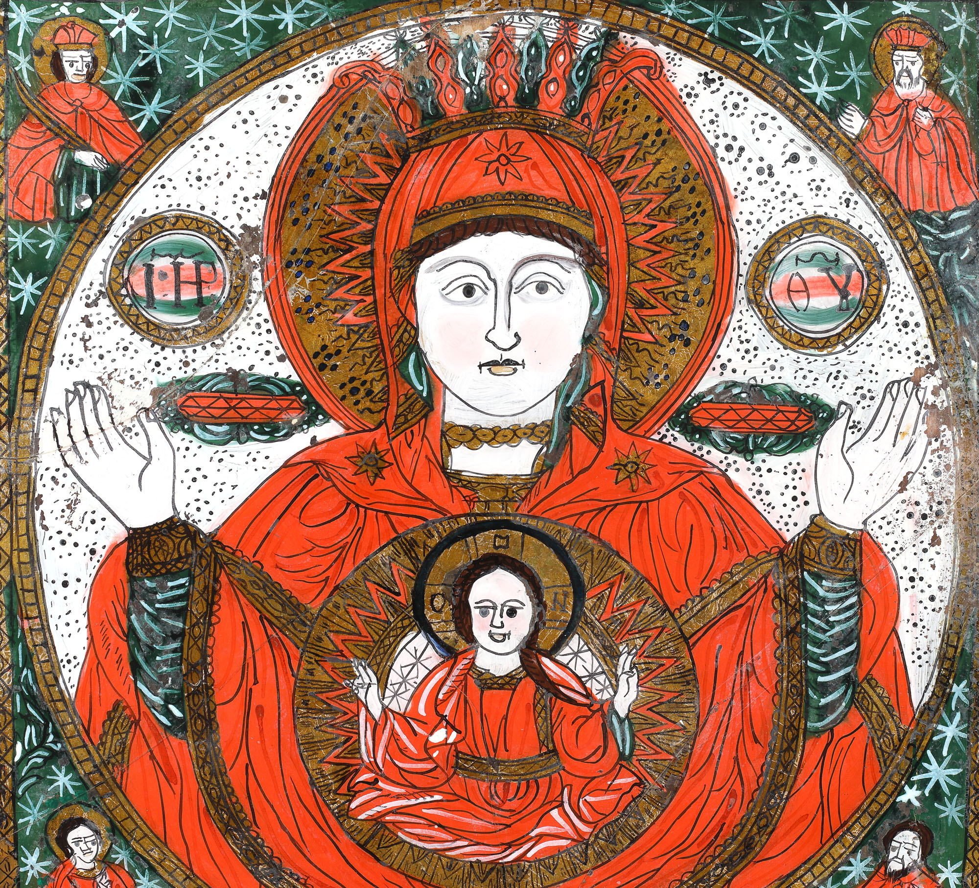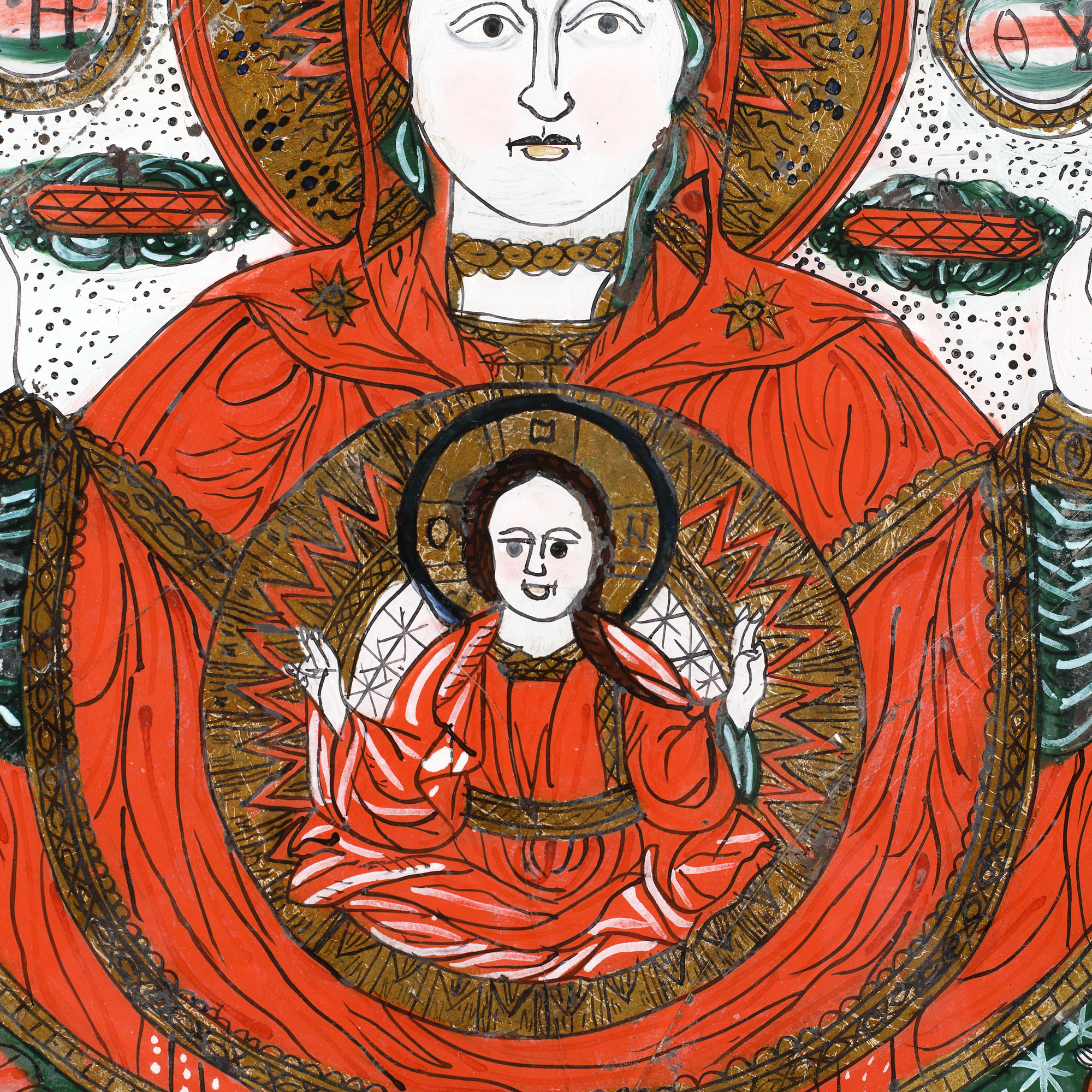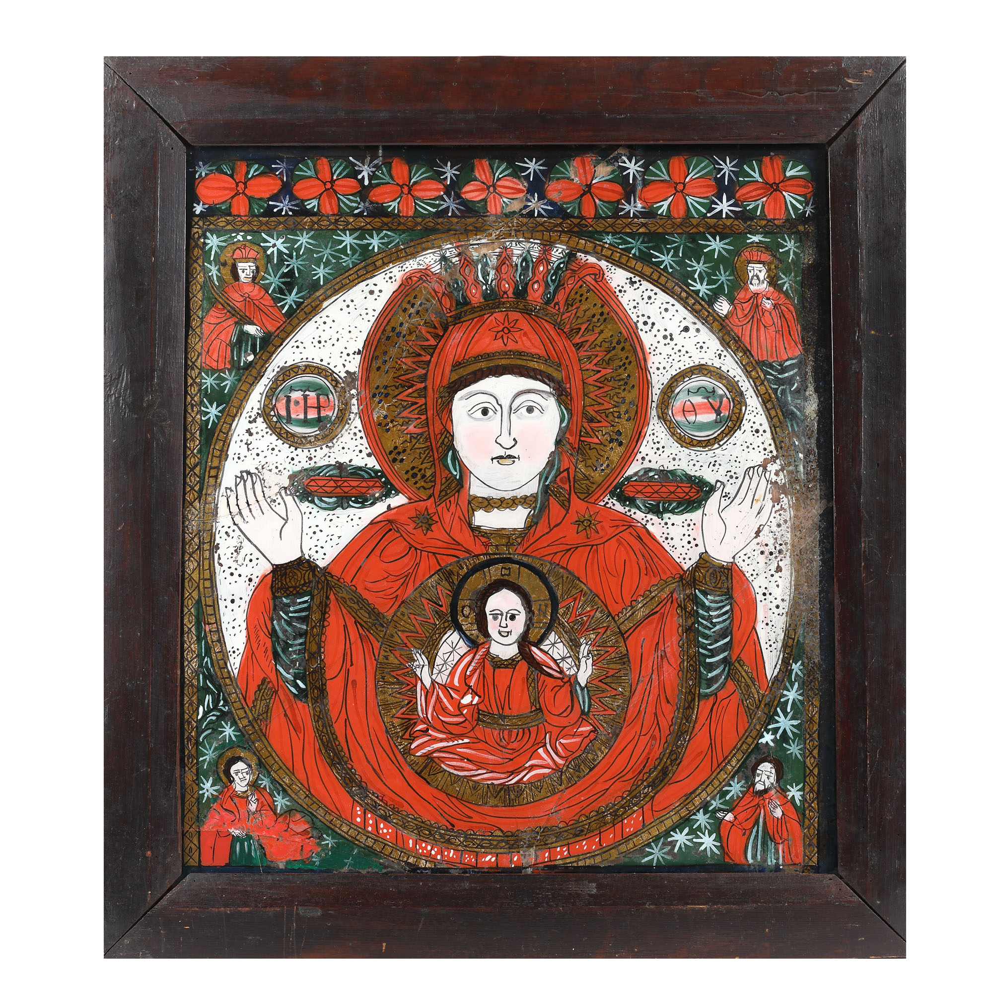 38. Icoană pe glajă, ”Maica Domnului a Semnului", ramă băițuită, atelier din Țara Bârsei, a doua jumătate a sec. XIX, piesă rară