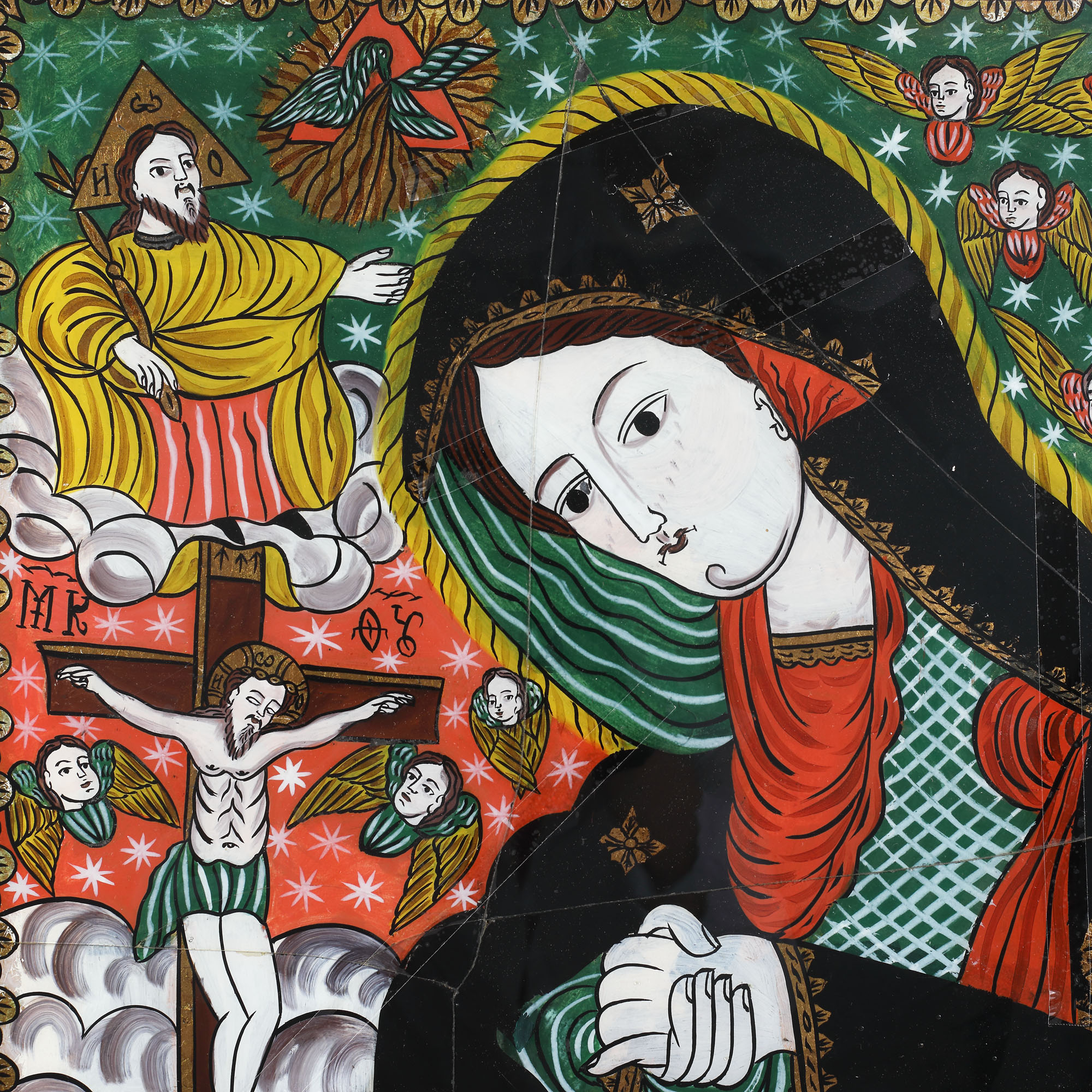 17. Icoană pe glajă, ”Maica Domnului Îndurerată”, ramă vopsită, cu șforț, atribuit zugrav Petru Tămaș-tatăl, Făgăraș, a doua jumătate a sec. XIX