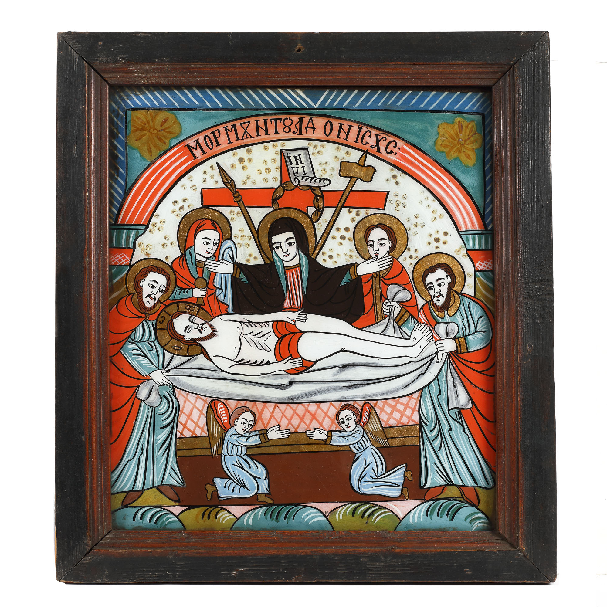 „Plângerea lui Iisus” este reprezentarea cea mai des întâlnită, alături de „Maica Domnului cu pruncul”, în creația pe sticlă atribuibilă iconarilor din familia Grecu.